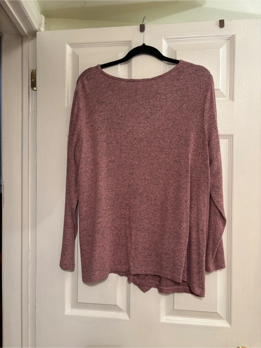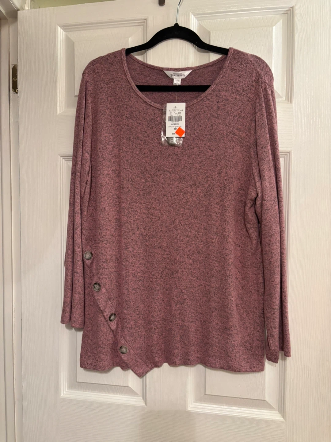 123Here's a Tradition brand long sleeve top for women in size Large. It features a unique asymmetrical hem with button details on the side. The colour is a lovely heathered mauve.