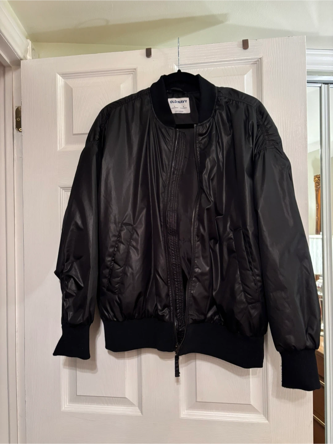 123Selling a black bomber jacket from Old Navy. It's in great condition and ready for a new home! Perfect for layering or wearing on its own during cooler weather