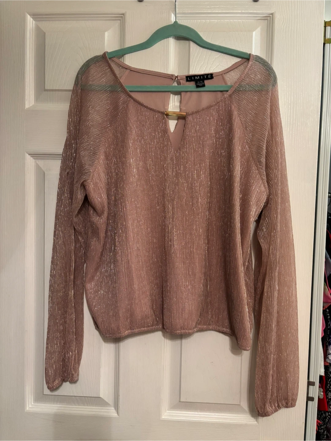 123Here's a lovely pink metallic blouse from Limited! It's in great condition and ready for a new home. Perfect for adding a touch of sparkle to your wardrobe