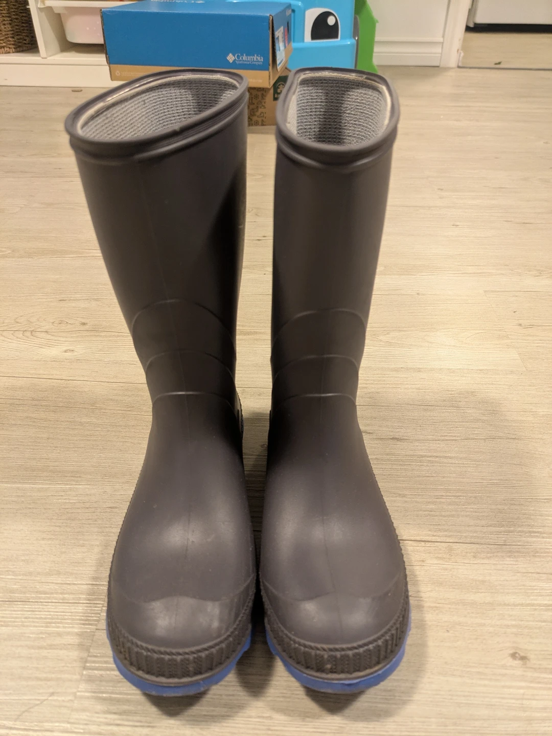 These Kamik rain boots are in great shape and ready for some puddle jumping! They're a size 2 and have a durable construction to keep little feet dry. The blue soles add a nice pop of colour too!