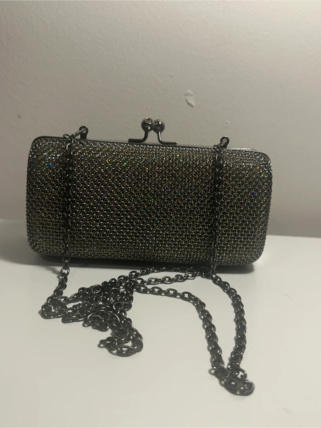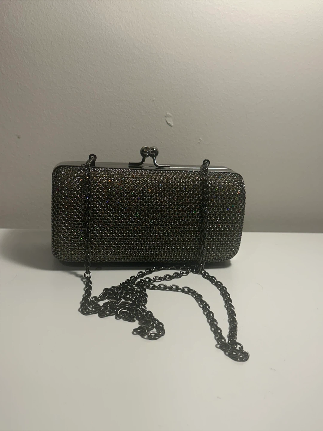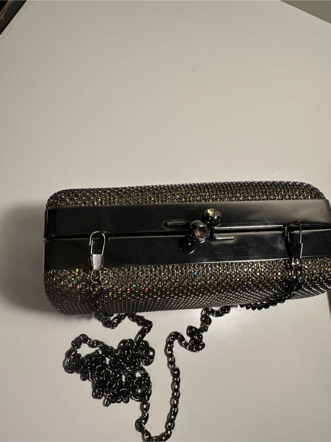 83This is a stylish evening clutch, perfect for a night out or special occasion! It features a chain strap and a secure clasp. The clutch is in great condition and ready to add some sparkle to your outfit