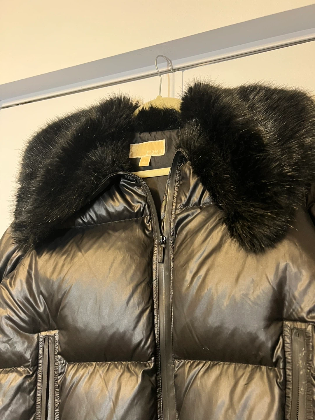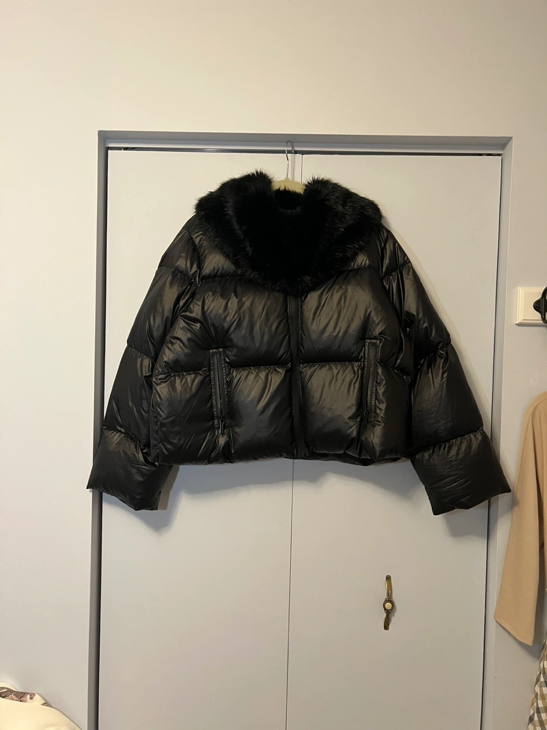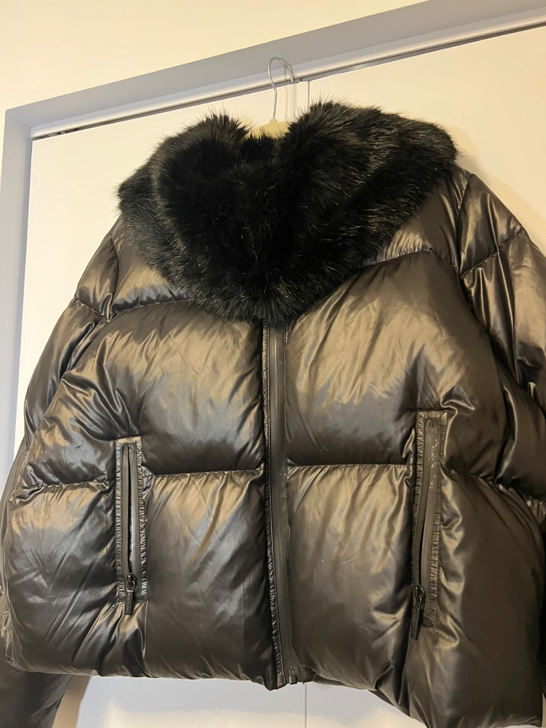 Chic black puffer with glossy finish. Features plush faux fur trim. Ideal for cold weather.