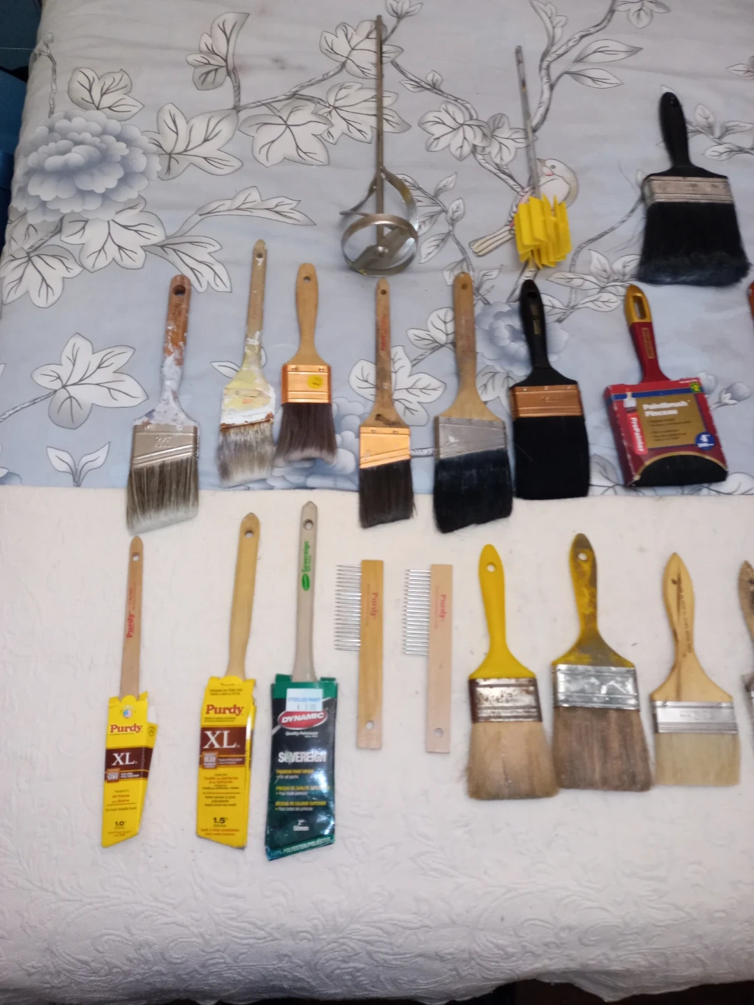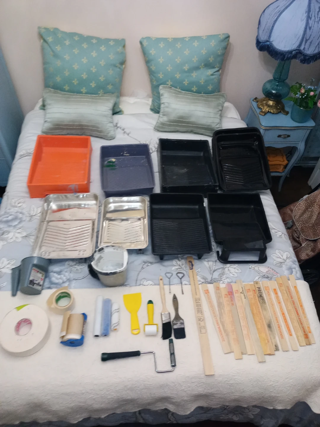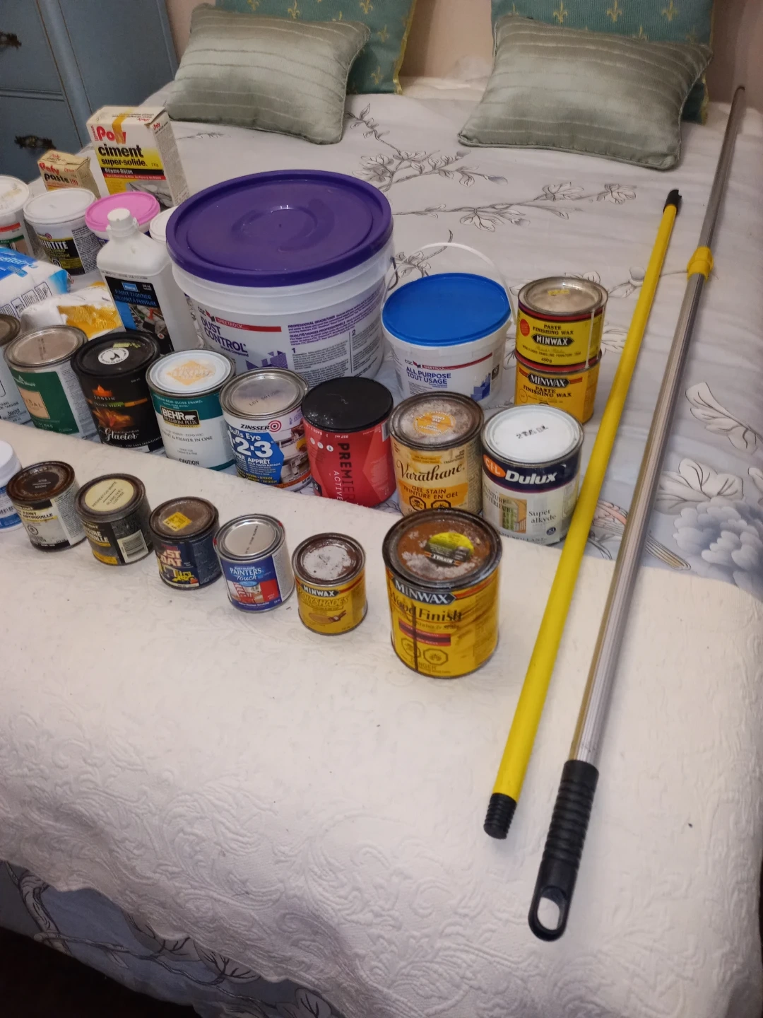 Some are New and some are used. See all pictures provided. The Measurement of the cloth drop sheet is 90" × 140" inches. There is also a roll of drywall tape. CGC low dust 12L pail is worth $50 alone and 3/4 full. Many paints, stains, lacquers are New. There are some New Purdy paint brushes. What you see on all the pictures is $108! Great Deal Here!