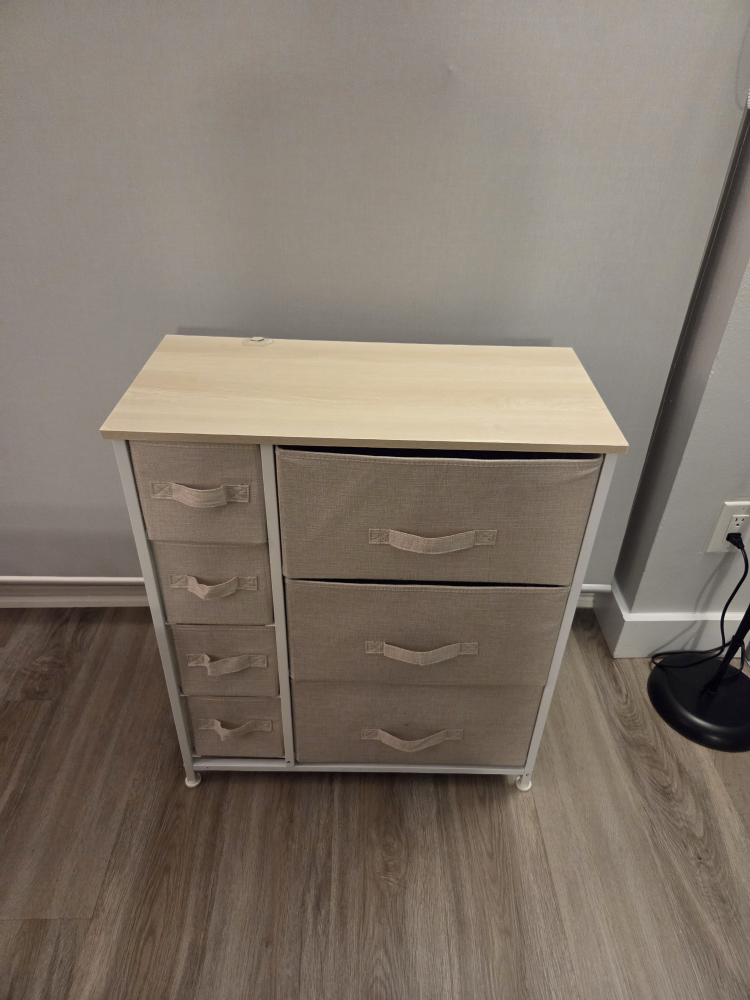 This storage dresser features a light wood-look top and a combination of small and large fabric drawers. It's perfect for organizing clothes or other items in a bedroom or closet. The neutral colours will fit in with any decor!