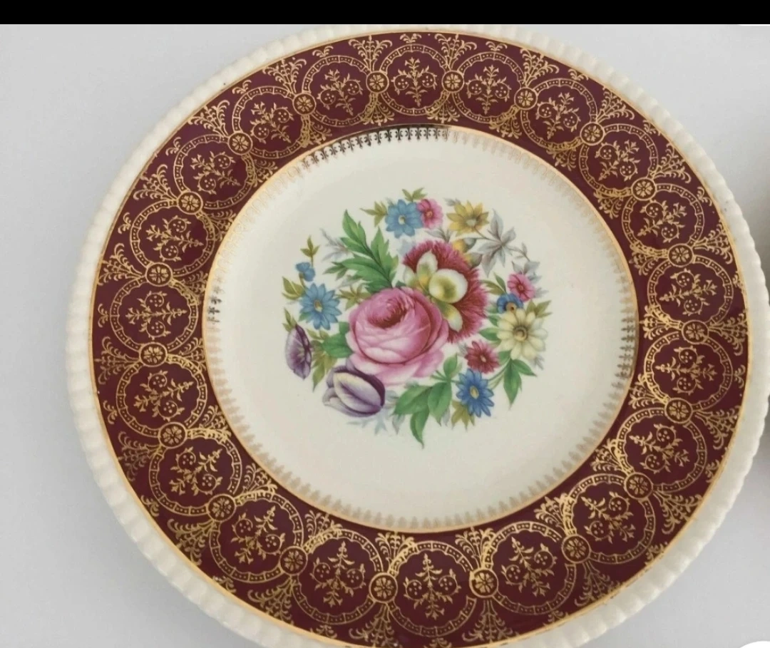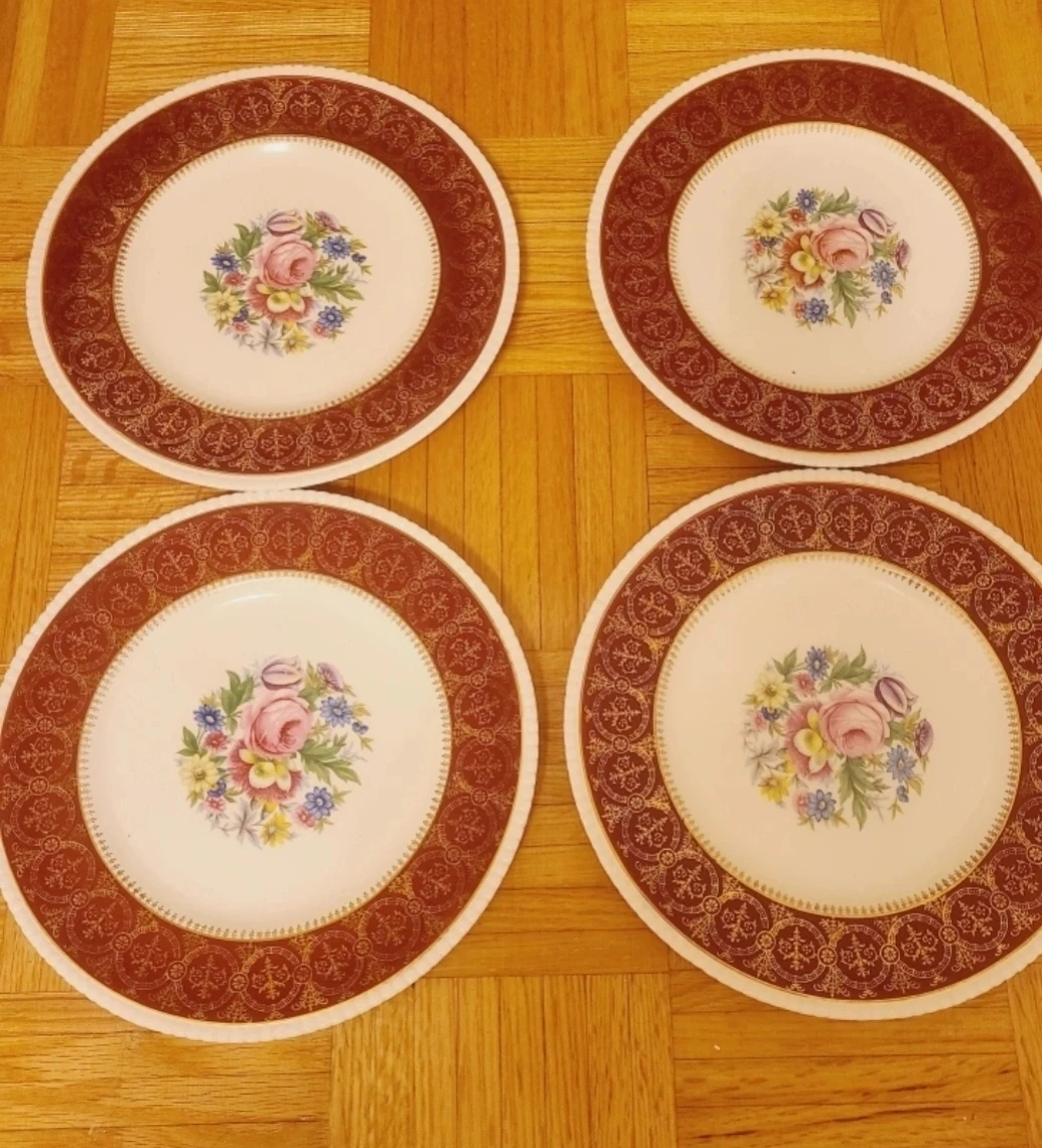 Selling a set of four Solian Ware plates by Simpsons (Potters) LTD. They feature a beautiful floral design with a burgundy and gold patterned border. Perfect for adding a touch of vintage charm to your table!
