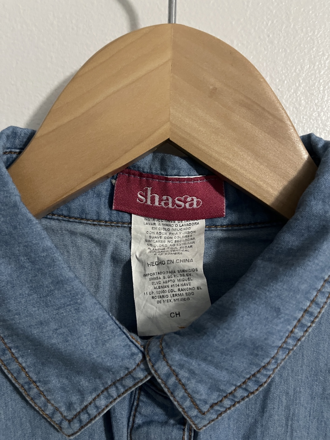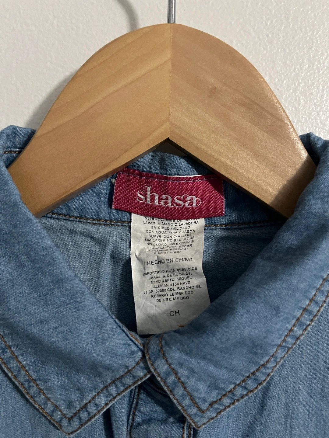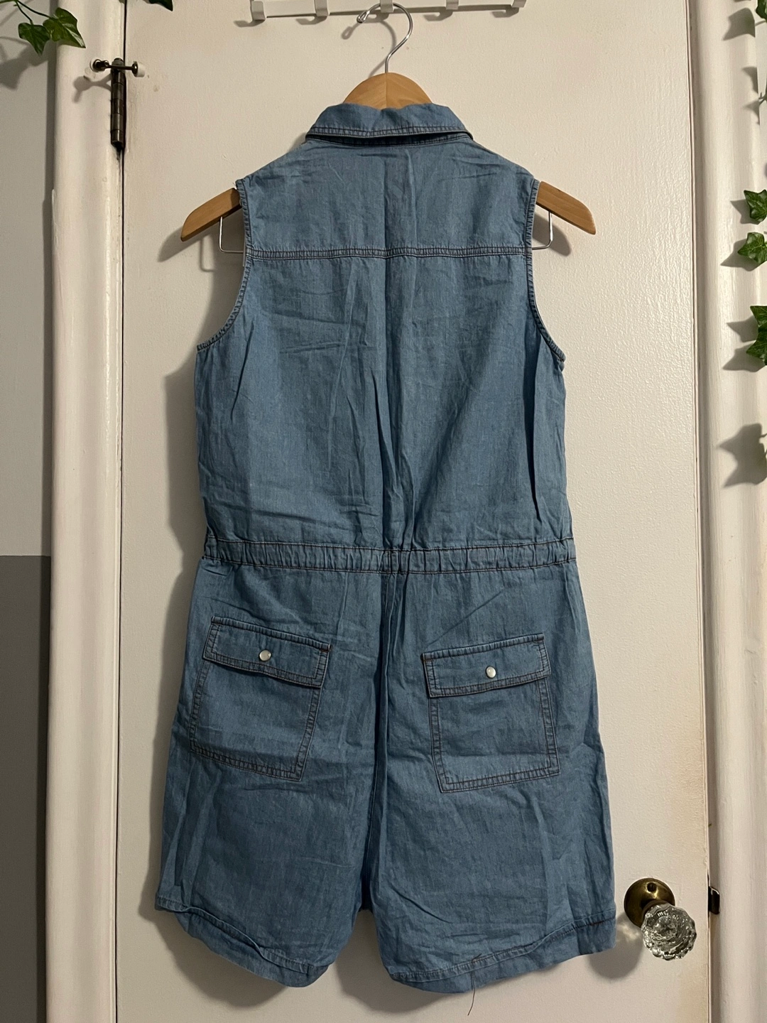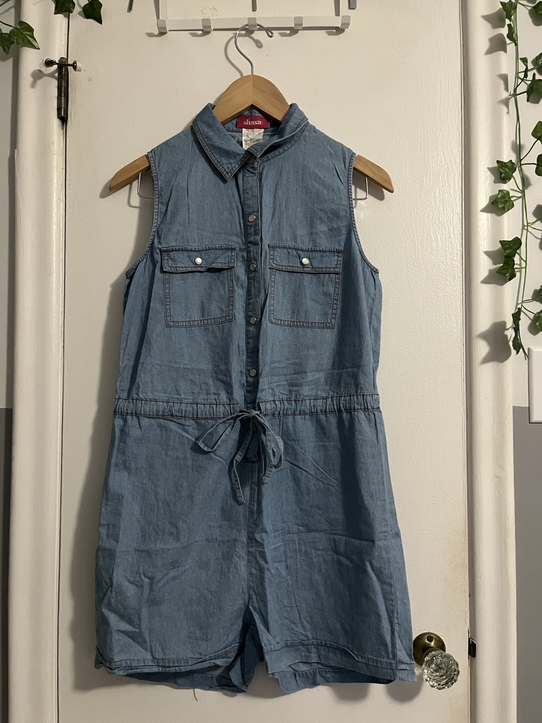 Selling a cute denim romper from Shasa! It's in great condition and features a collared neckline, button-down front, and a tie waist. Size is S, but can fit M as well. Perfect for a casual summer day!