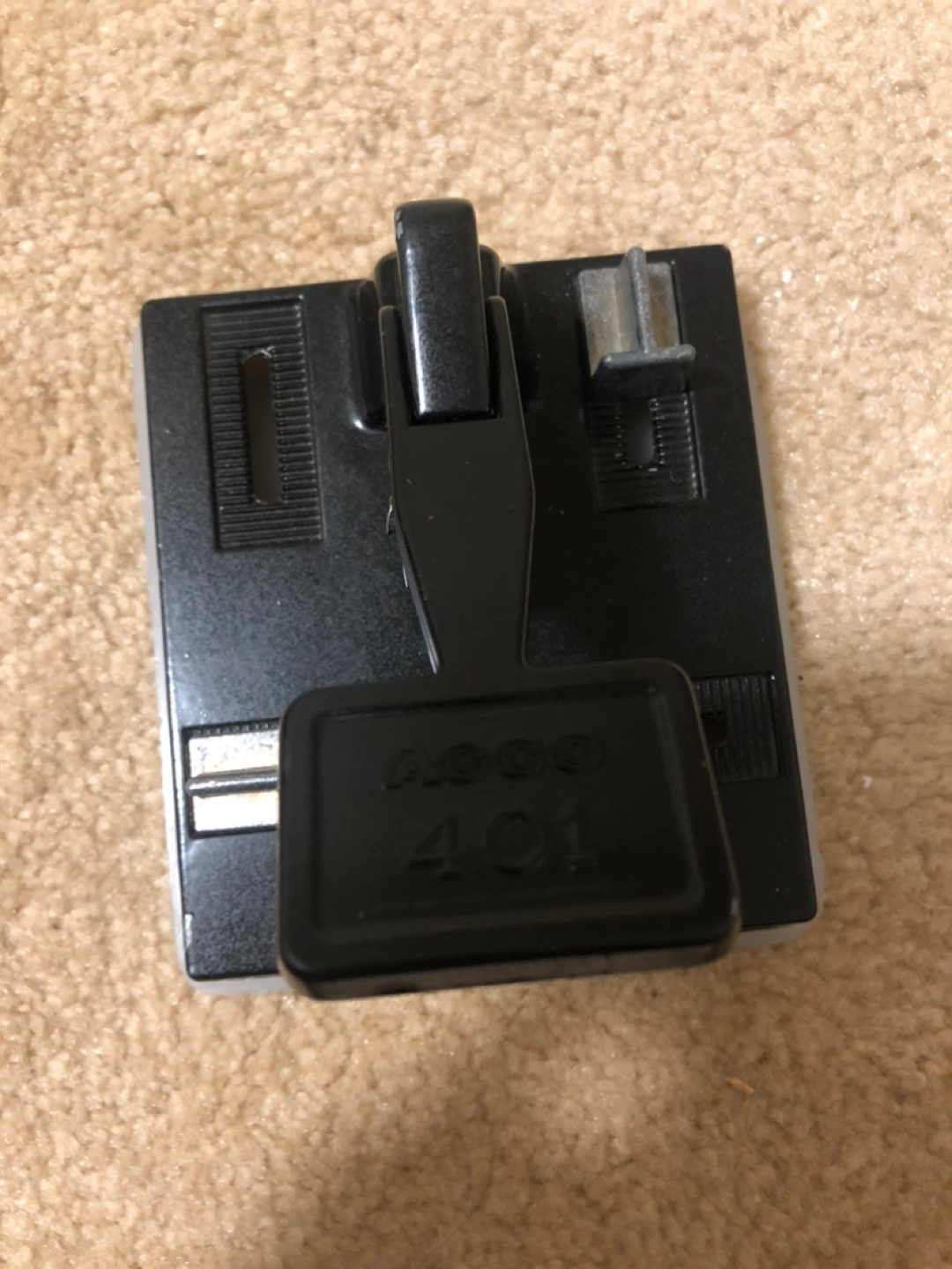 This item has been gently used and it is from a pet-free, smoke-free home. For more information see: https://accobrandscanada.com/products/one-hole-desktop-lever-punch-401/ - a comparable puncher from swingline sells for $57.99: https://www.creativebasics.net/Shop/Office-Supplies/Essentials,-Everyday-Desk-Supplies/Punches/Desktop-Punches/57076/