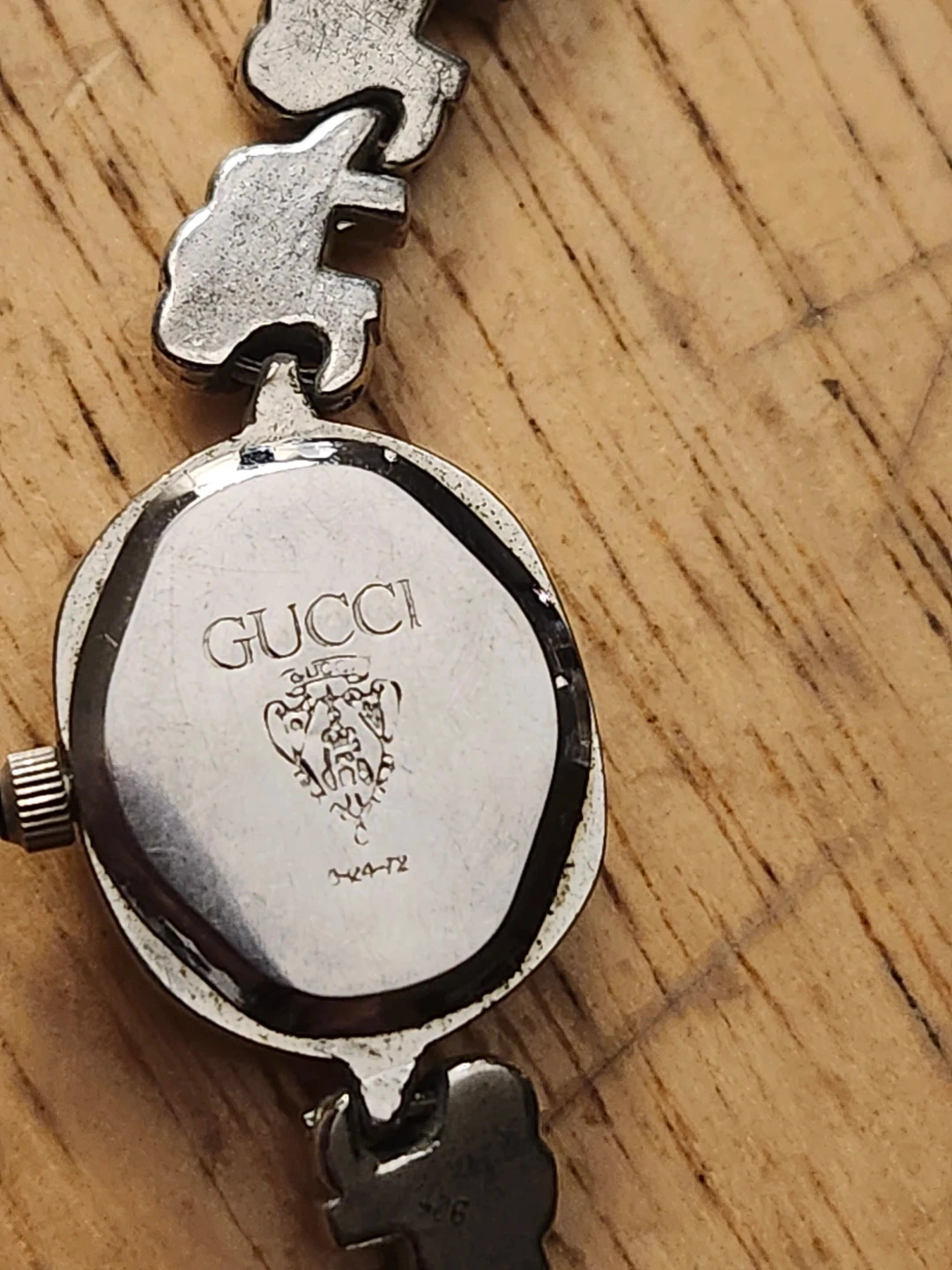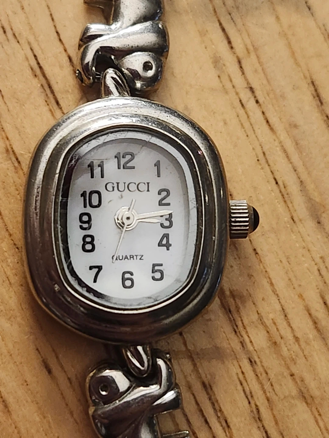 Selling a stylish Gucci women's quartz watch. It features a unique silver-tone band with a distinctive design. The watch has a white face with black numerals and the Gucci logo. A fashionable timepiece to add to your collection!