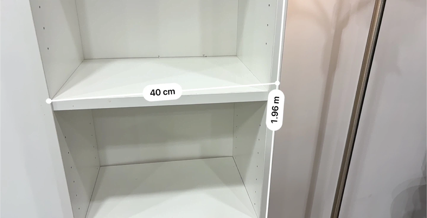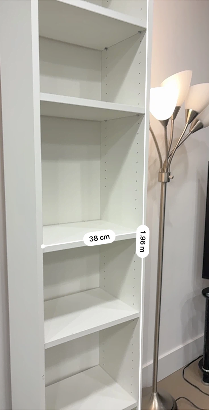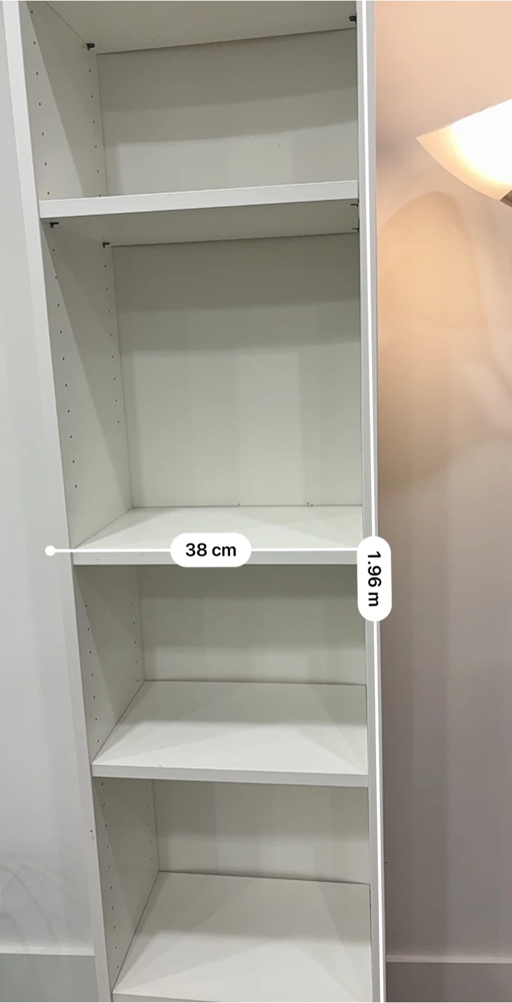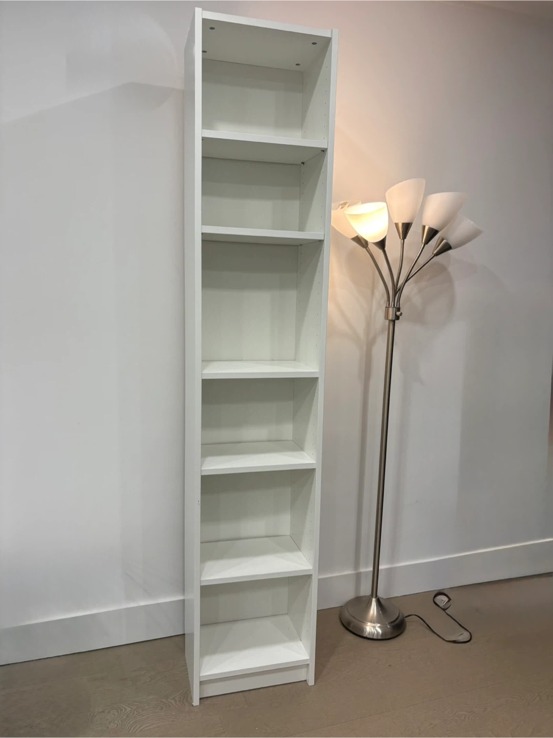 Selling a white bookcase in great condition! It measures approximately 40cm wide and 1.96m tall. Perfect for organizing your books or displaying your favourite items
