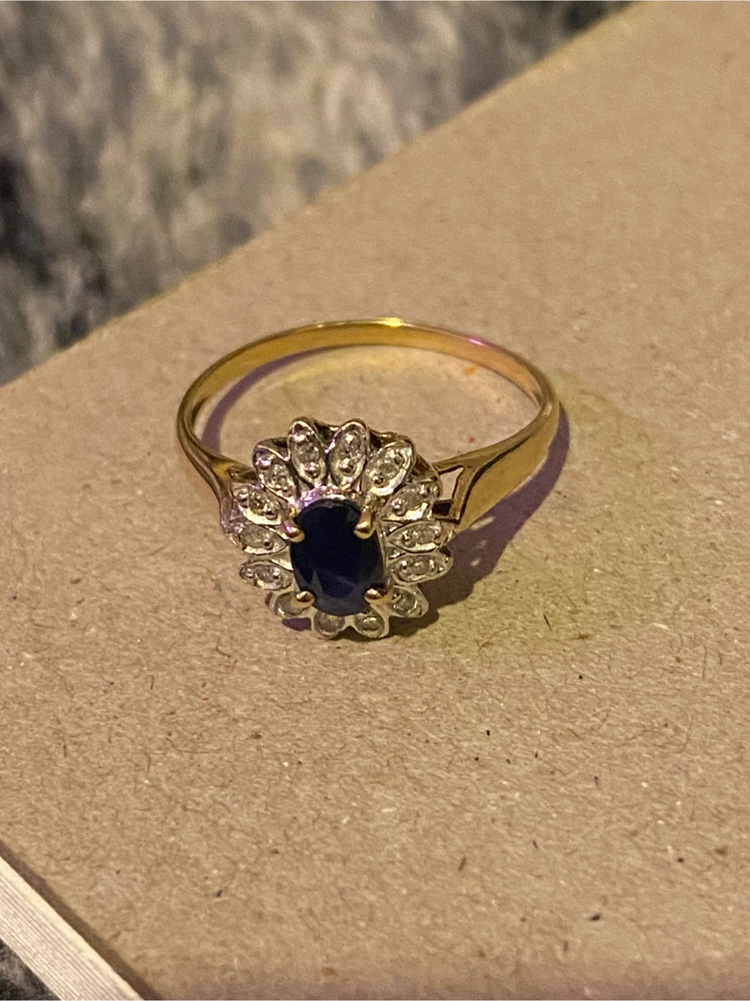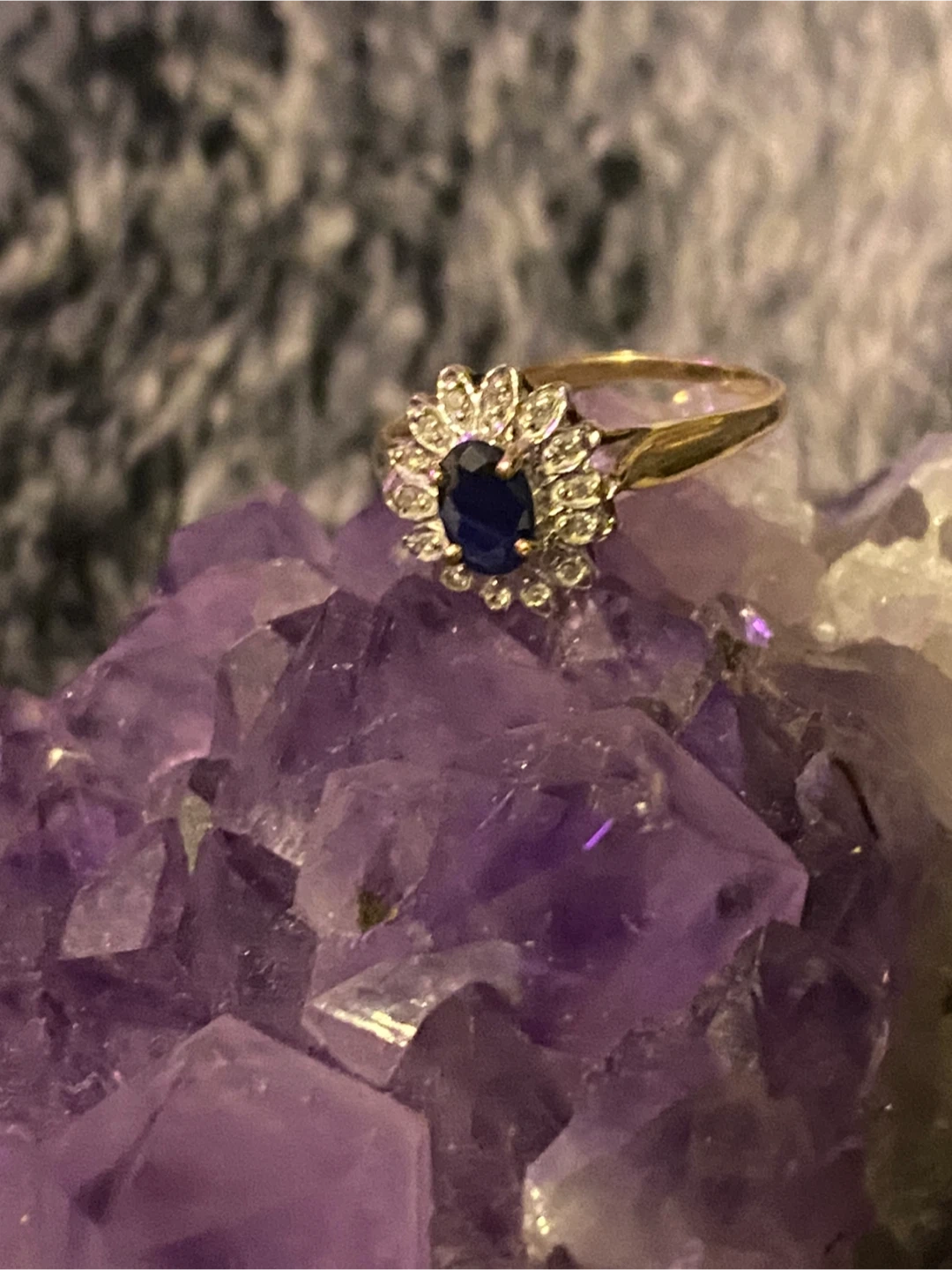 103Selling a beautiful 10 karat 1.8 grams size 6 and a half gold ring featuring a sapphire surrounded by diamonds. It's in great condition and ready for a new home!
