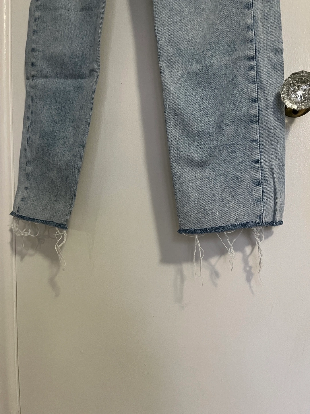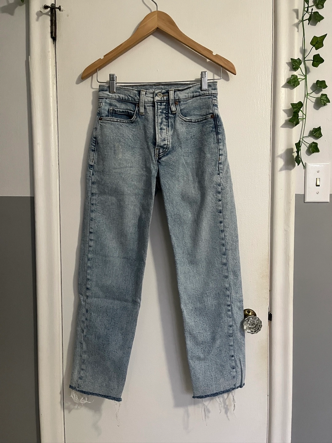 Selling a pair of Old Navy high waisted straight jeans in a size 0. The denim has a light wash and raw hems. They're in great condition and ready for a new home!