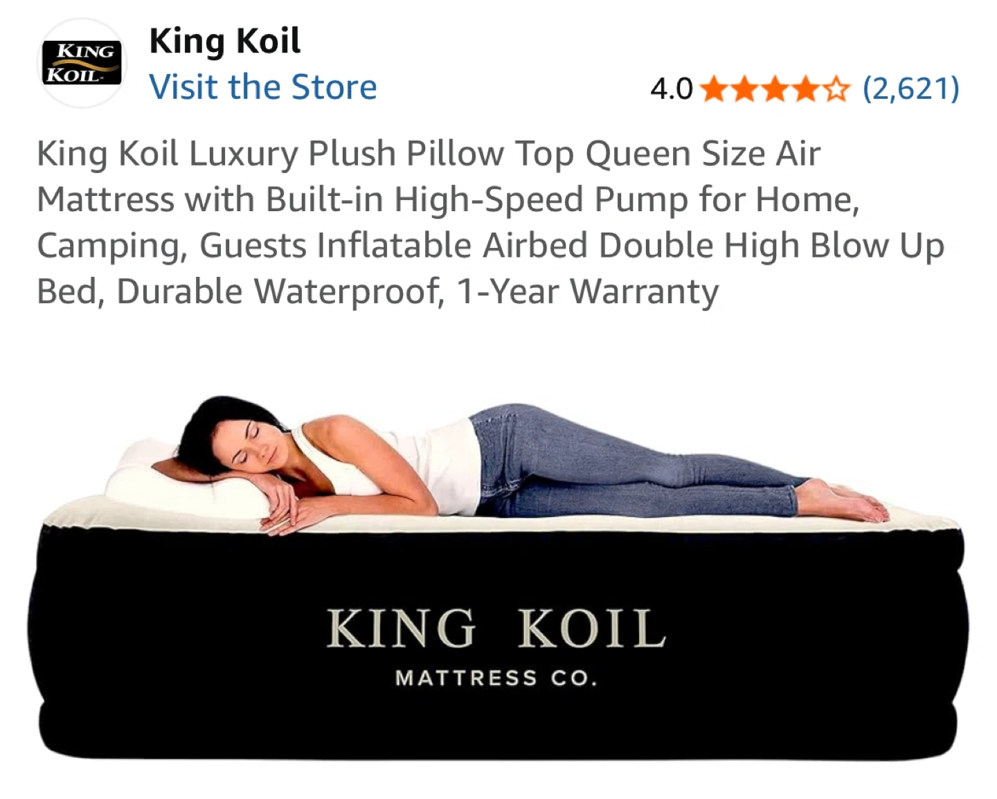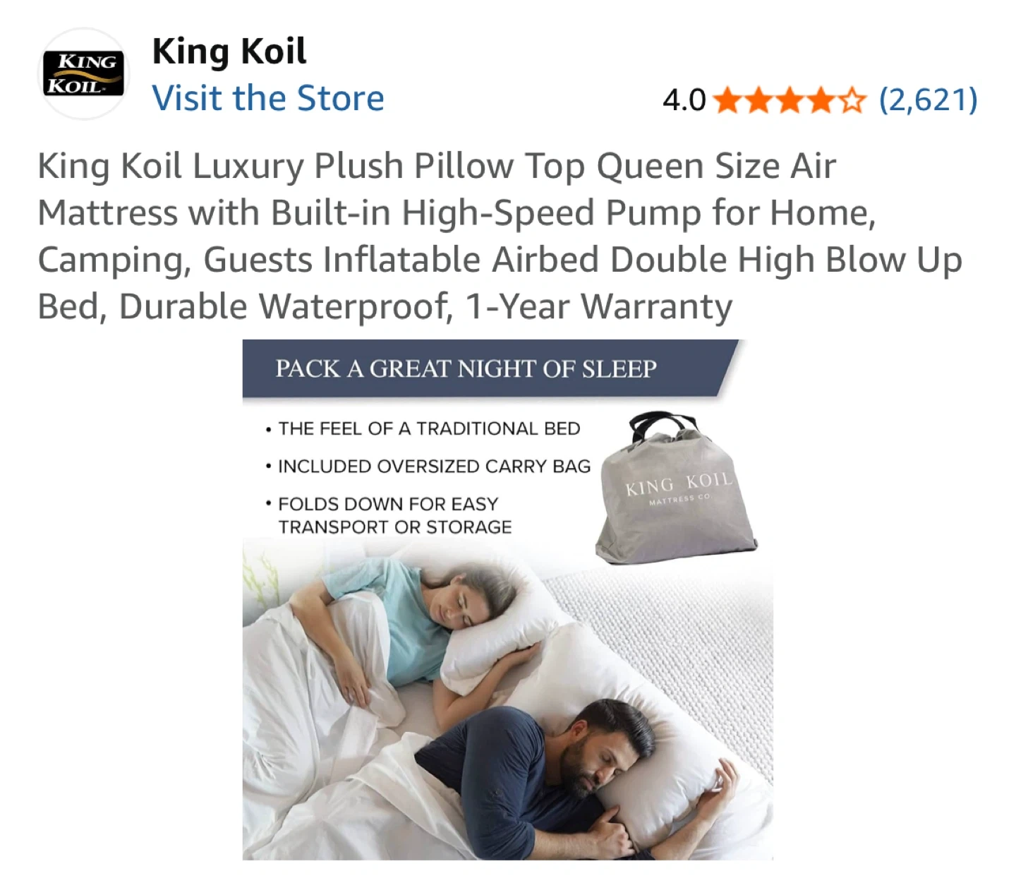 Selling a King Koil Luxury Plush Pillow Top Queen Size Air Mattress with Built-in High-Speed Pump! It's perfect for home, camping, or guests. This inflatable airbed is durable and waterproof and comes with a 1-year warranty. It also features enhanced coil technology for a sound night's sleep. It includes an oversized carry bag and folds down for easy transport or storage. It fully inflates in 2 minutes!