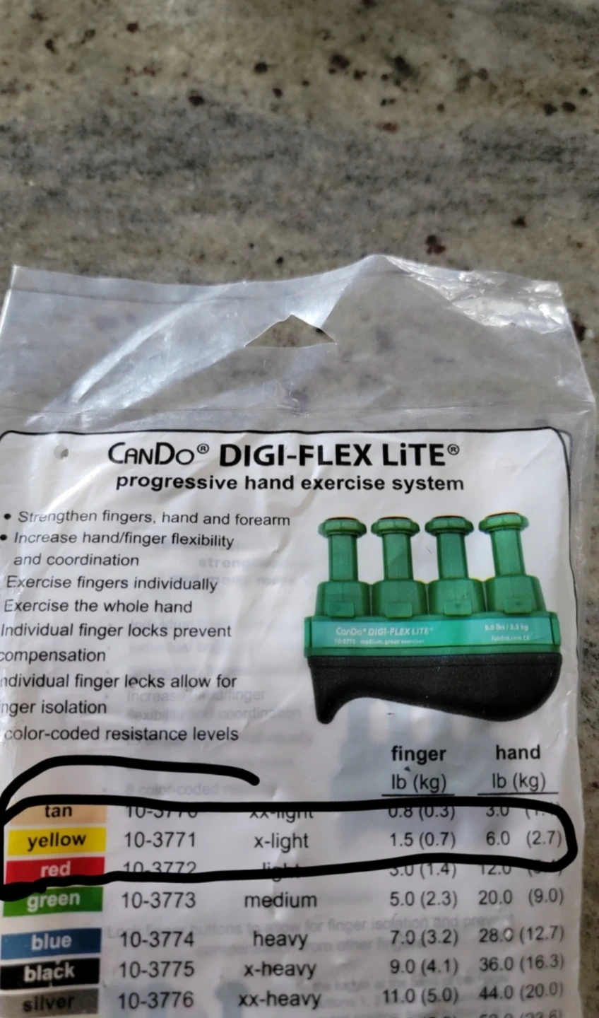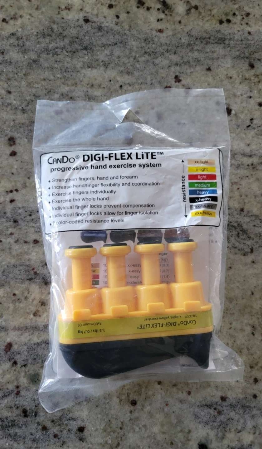 CanDo DIGI-FLEX LITE progressive hand exercise system to strengthen fingers, hand, and forearm. It increases hand/finger flexibility and coordination. The color-coded resistance level is yellow, which is x-light.
