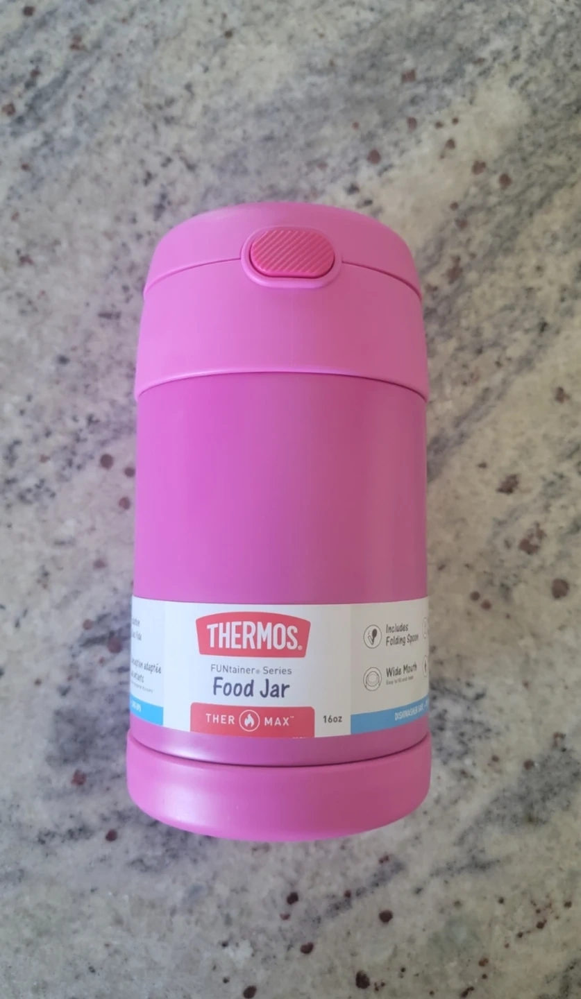 Keep your little one's food fresh with this Thermos FUNtainer food jar! It's a 16oz jar perfect for school lunches or picnics. It includes a folding spoon, making it super convenient for on-the-go meals