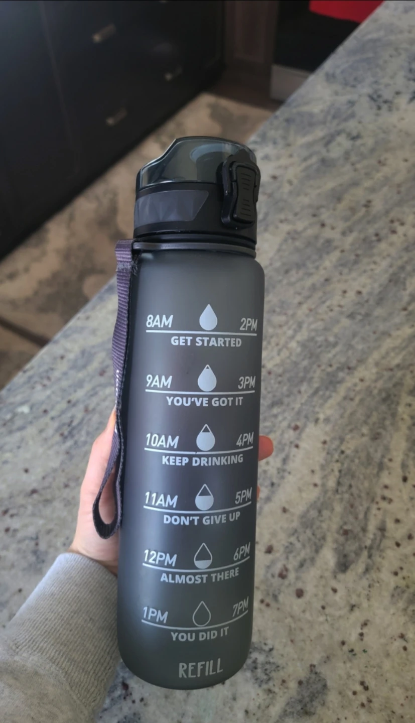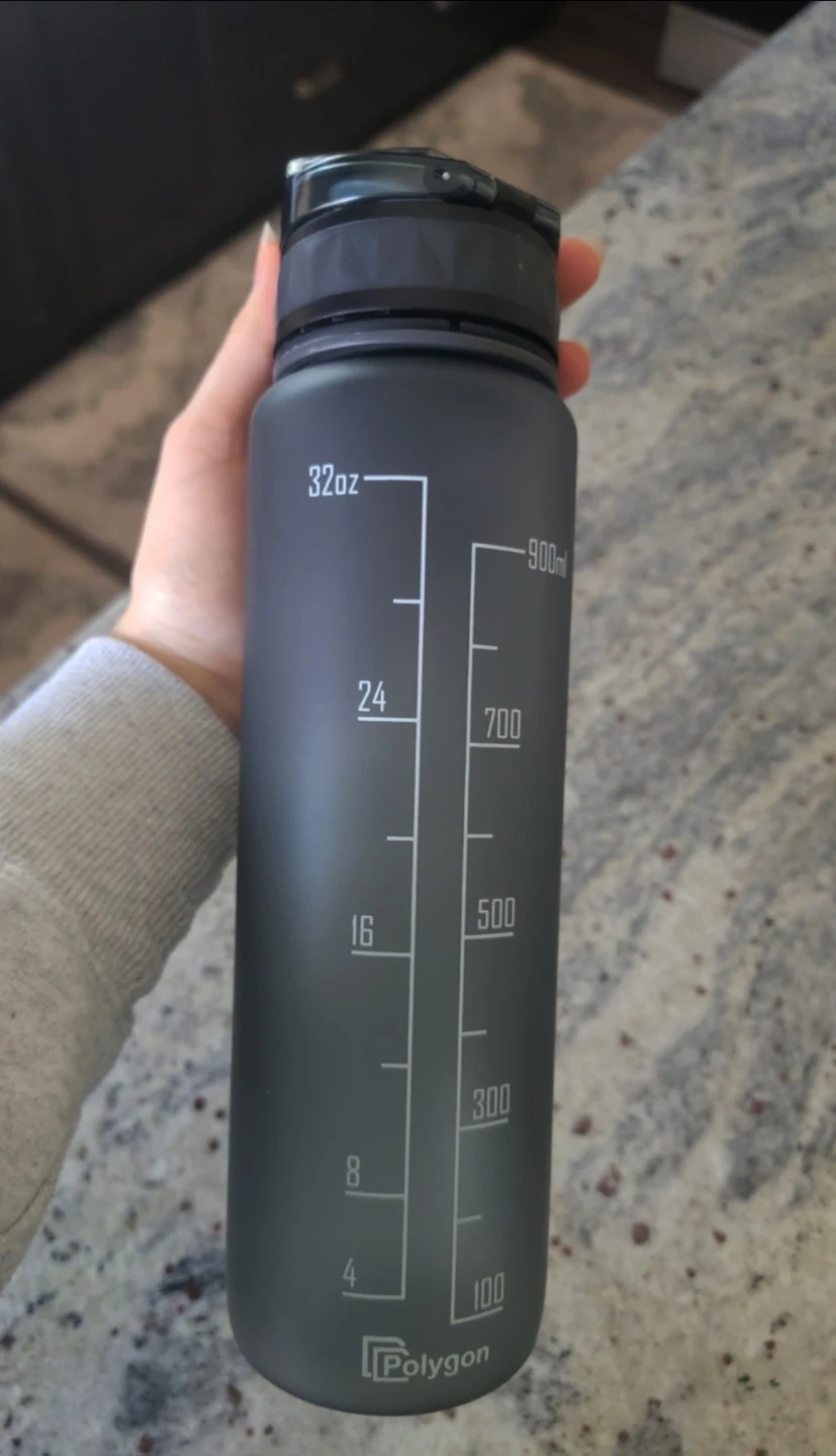 Selling a Polygon water bottle, perfect for staying hydrated! It's a 32oz bottle with time markers to help you track your water intake throughout the day. Great for the gym, hiking, or just everyday use