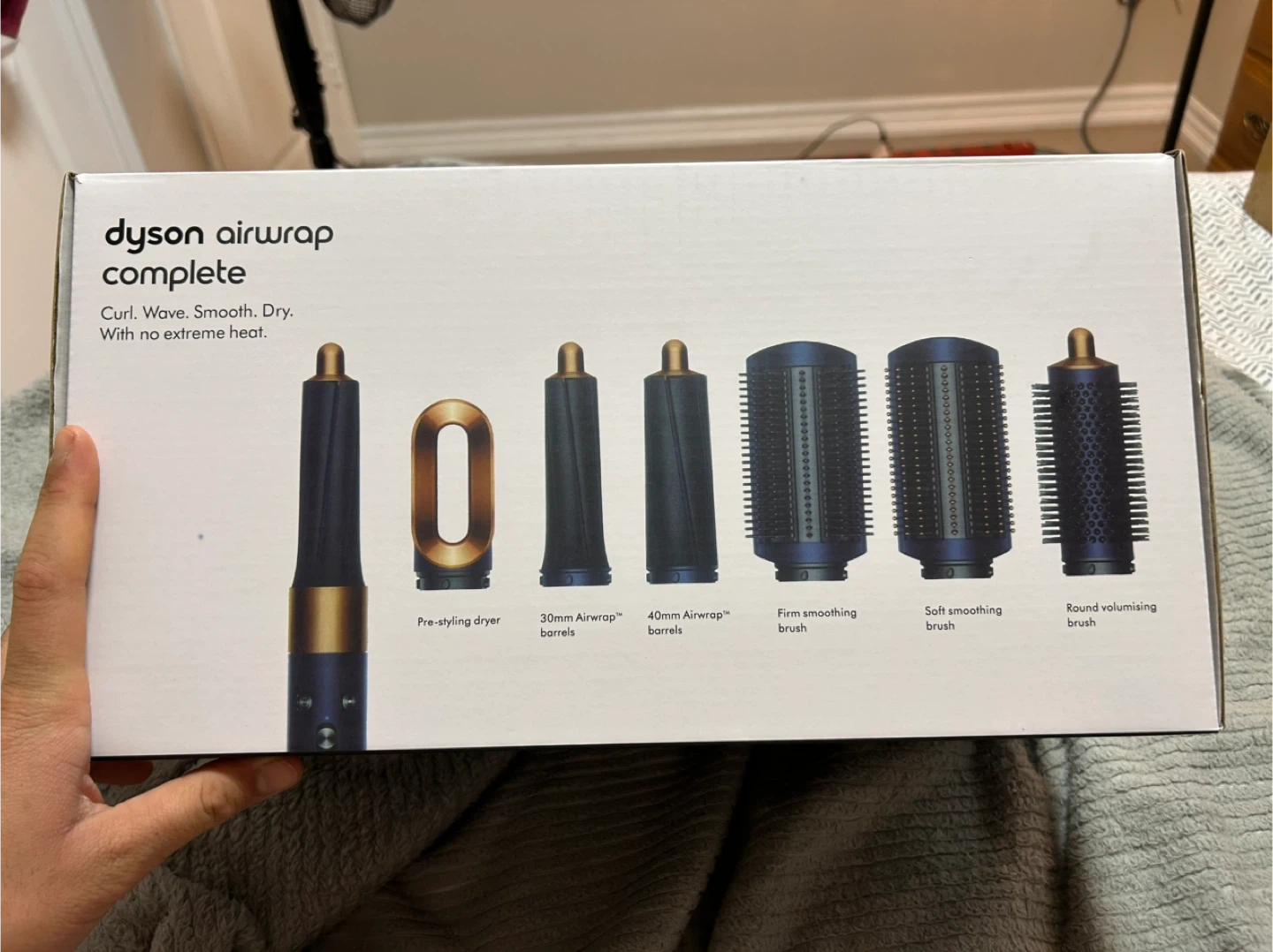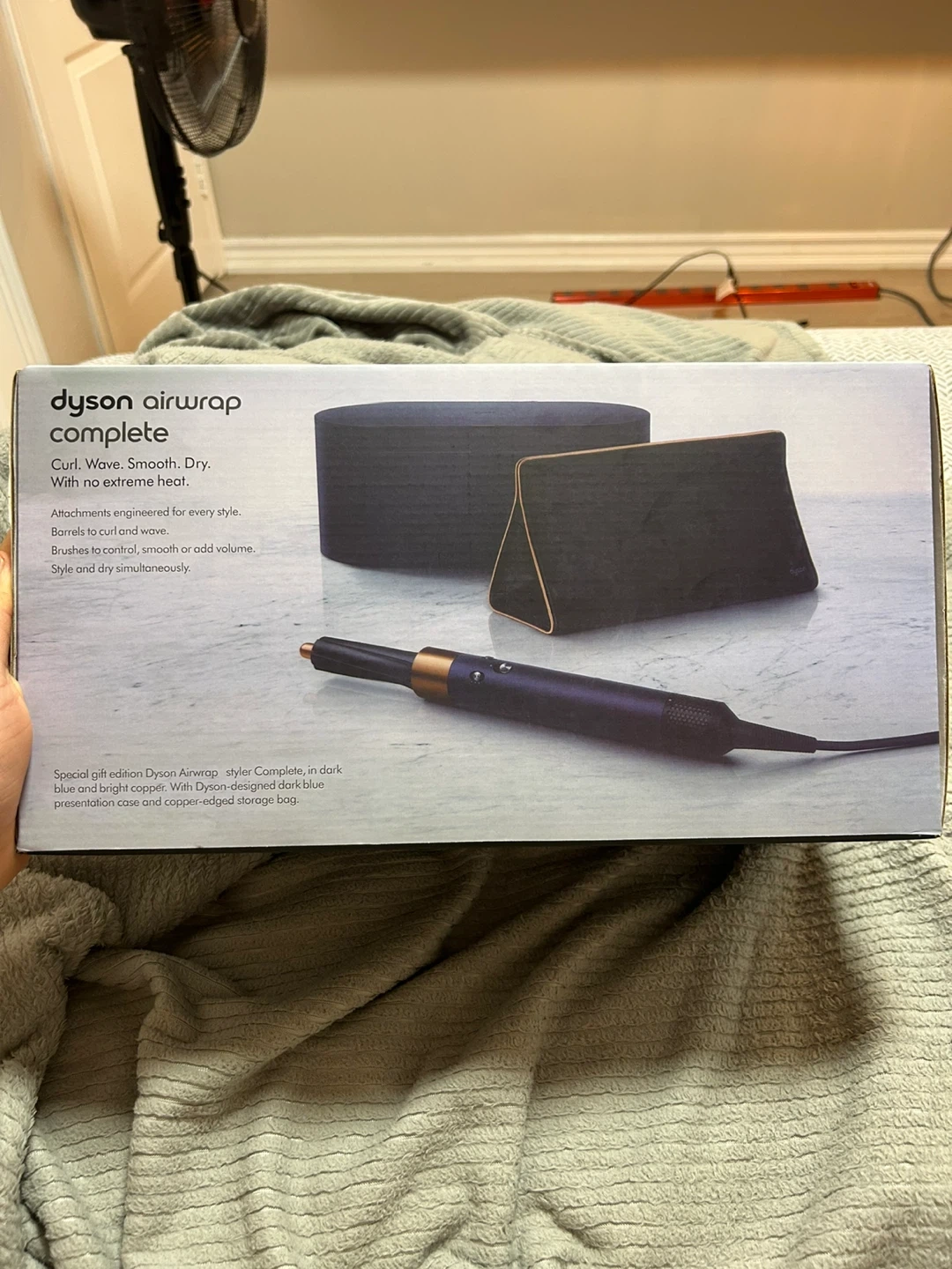 65Selling a Dyson Airwrap Complete in the special edition dark blue and bright copper colour. This styler can curl, wave, smooth and dry your hair with no extreme heat. It comes with various attachments for every style, including: - Pre-styling dryer - 30mm Airwrap barrels - 40mm Airwrap barrels - Firm smoothing brush - Soft smoothing brush - Round volumising brush - Presentation case and copper-edged storage bag Also included is the box!