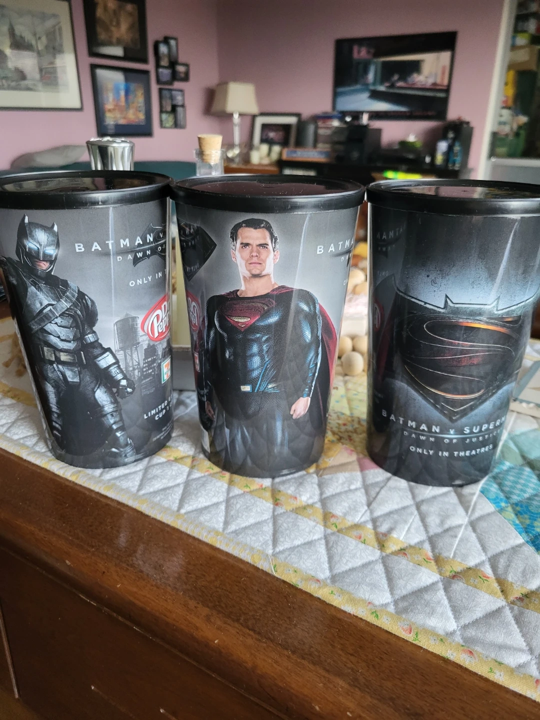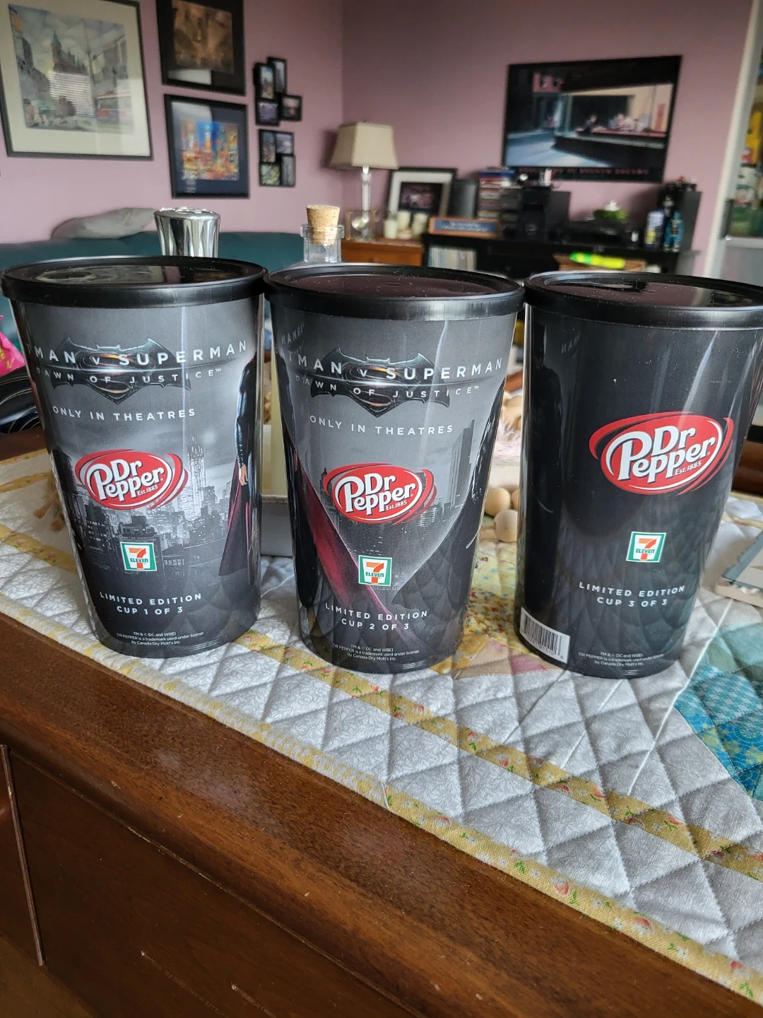 Selling a set of three limited edition cups from 7-Eleven, featuring Batman vs Superman: Dawn of Justice and Dr. Pepper logos! These cups are New, never used, lids included, and would be perfect for any DC Comics or Dr. Pepper collector.