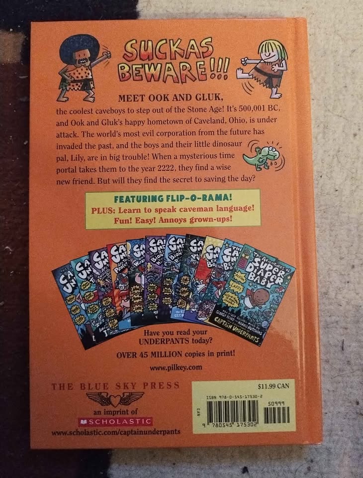 I'm selling a hardcover book by Dav Pilkey, author of Captain Underpants. The book follows the story of two crazy kung-fu cave boys, Ook and Gluk, growing up in Caveland, Ohio. With action, laughs, and comic strips, this book is packed with excitement. Please note that the collector cards are not available.