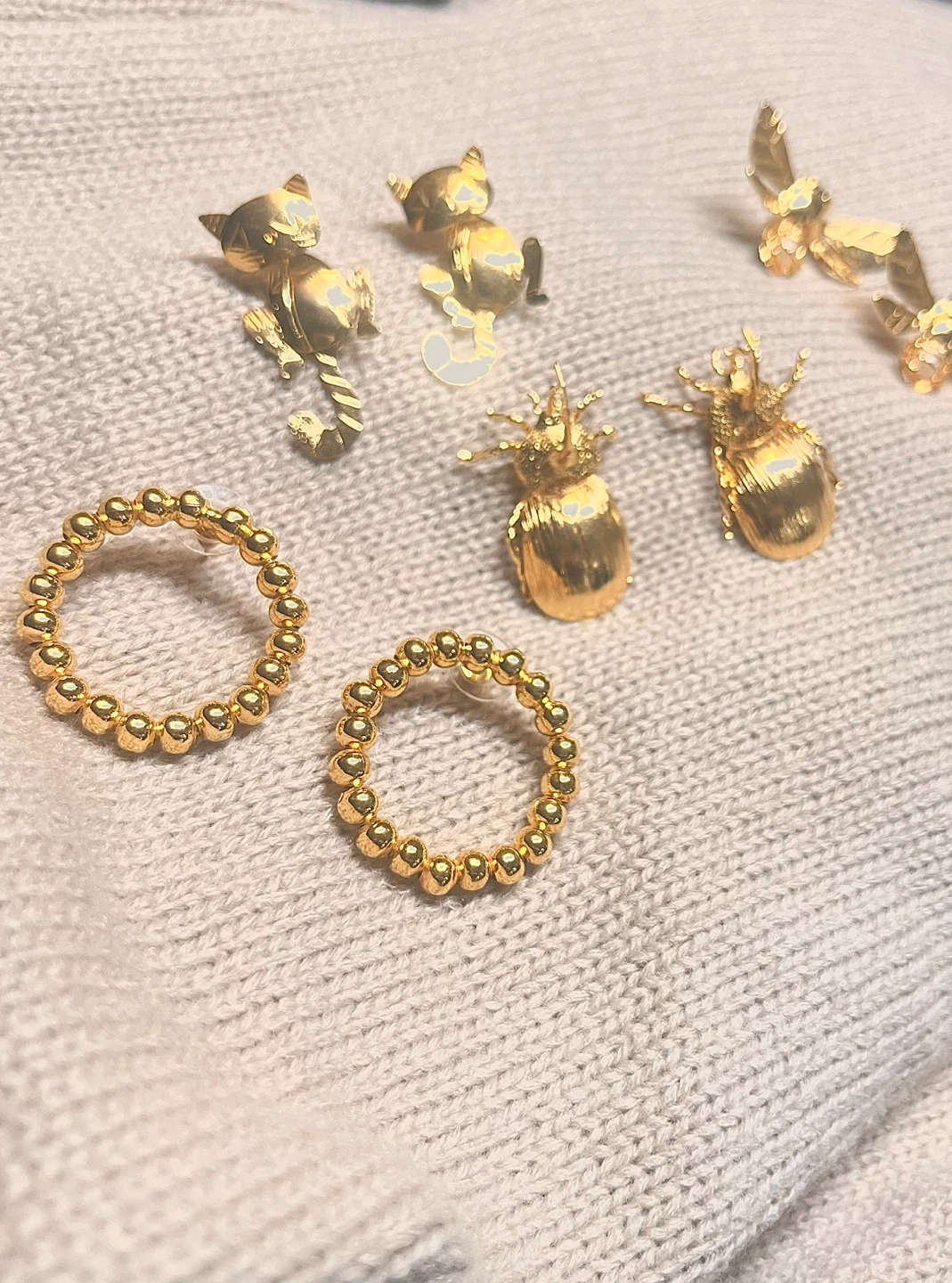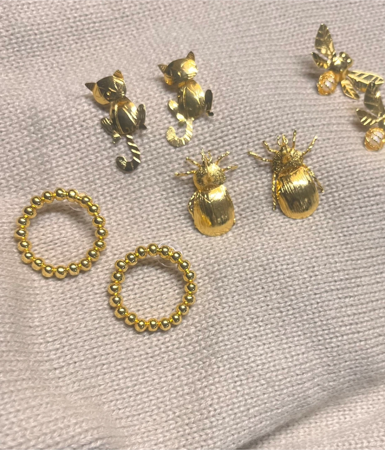 I sell a cute collection of earrings and rings crafted in 18k gold plated bronze! There are earrings in the shape of a cat, bee, beetle and in the shape of a circle. Perfect for adding a touch of whimsy to any outfit