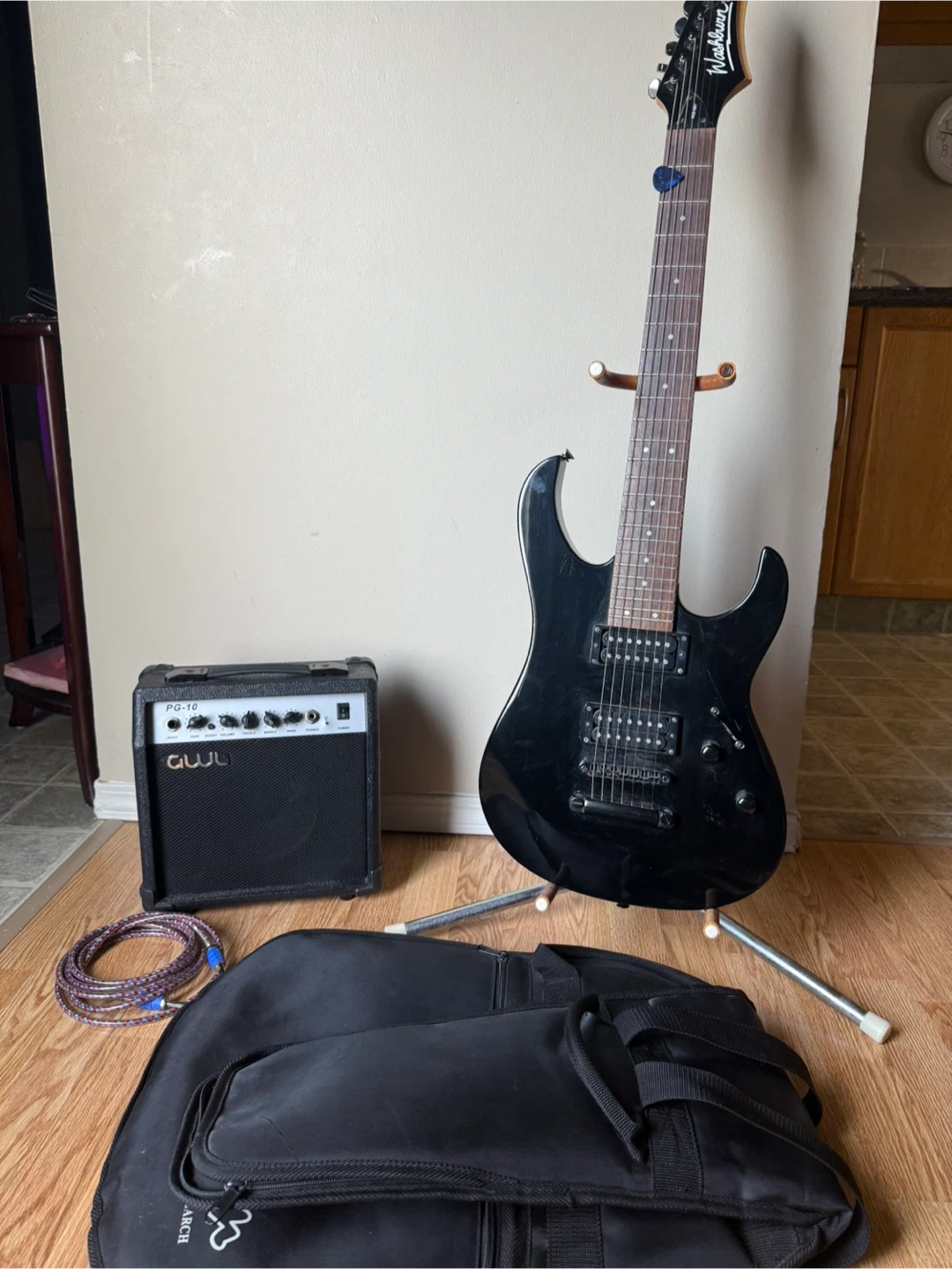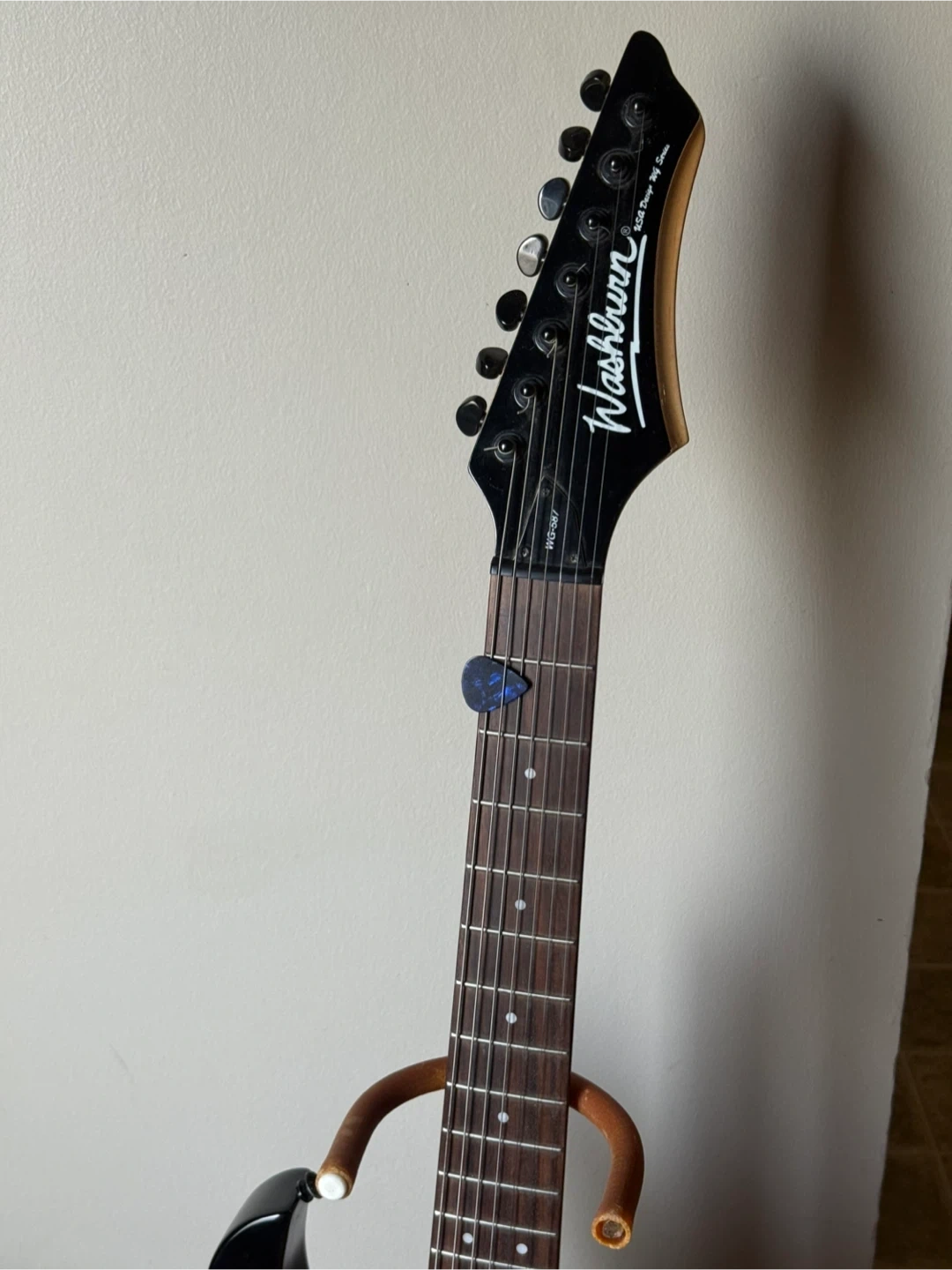 Shred like a pro with this Washburn Pro 7-string guitar WG-587, designed for heavy riffs and soaring solos! This used axe is ready to rock, featuring a sleek black finish and wicked tone. While it shows signs of use, it's packed with potential for any metalhead or progressive player. Unleash your inner guitar hero today!