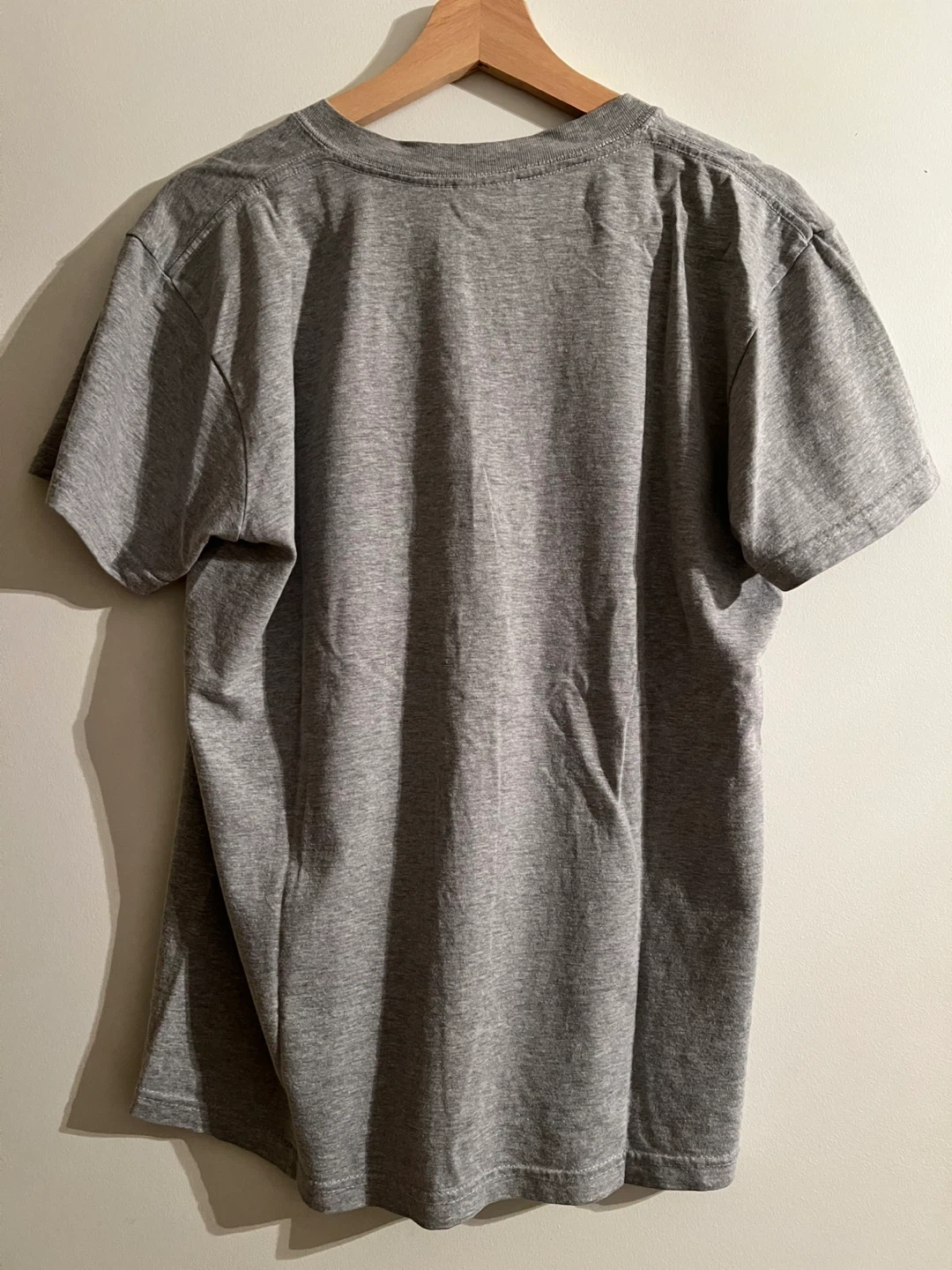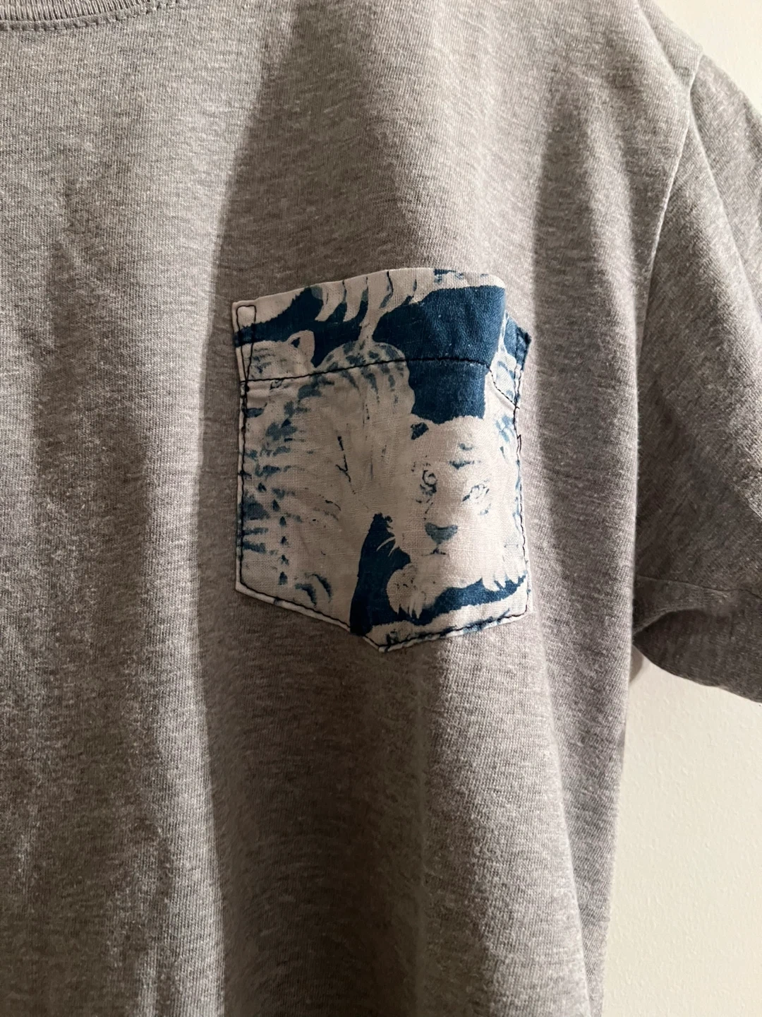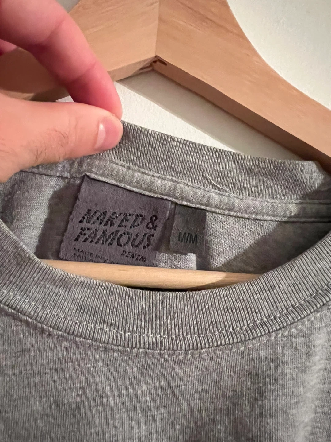 Selling a gently used Naked & Famous grey t-shirt in size medium. It has a unique pocket design, adding a bit of flair to a classic tee. Perfect for casual wear!