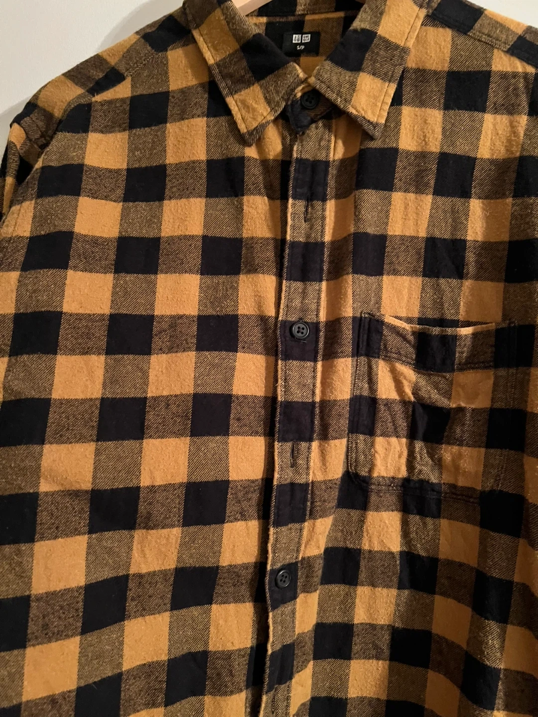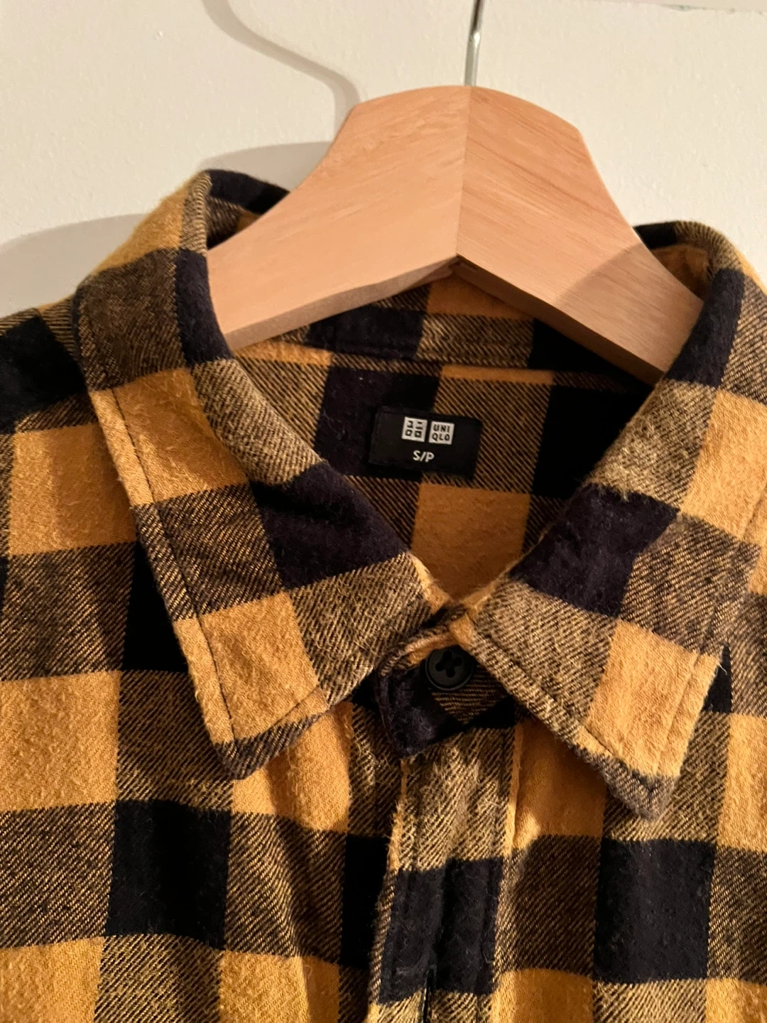 Cozy Uniqlo flannel shirt in a stylish black and gold plaid pattern! It's a size S/P and in great condition. Perfect for layering or wearing on its own