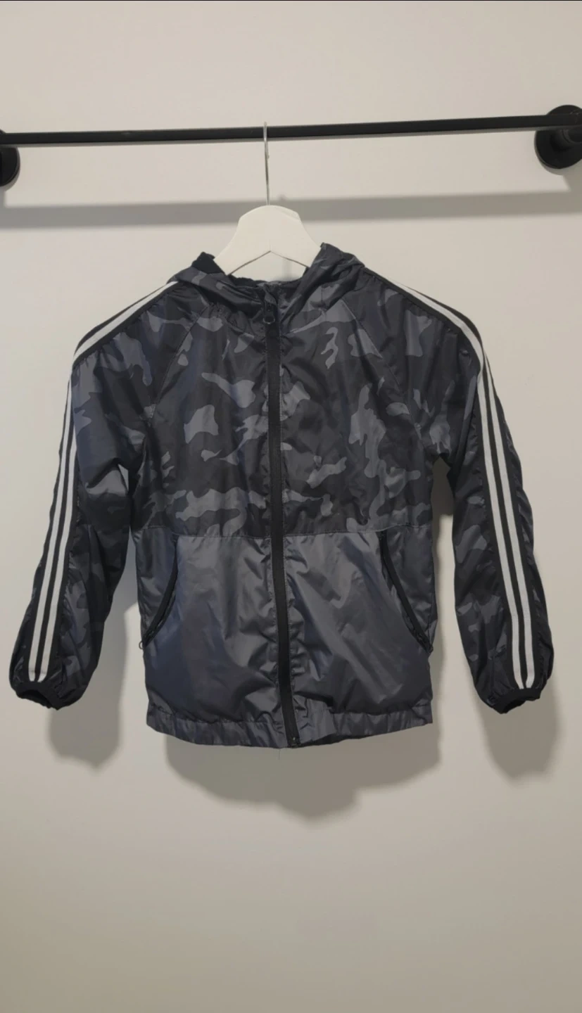 Check out this cool camo windbreaker from George! It's a size M (7-8) and perfect for those breezy days. It features a stylish camo pattern with the classic three stripes on the sleeves. Great for keeping your little one protected from the wind while looking fashionable
