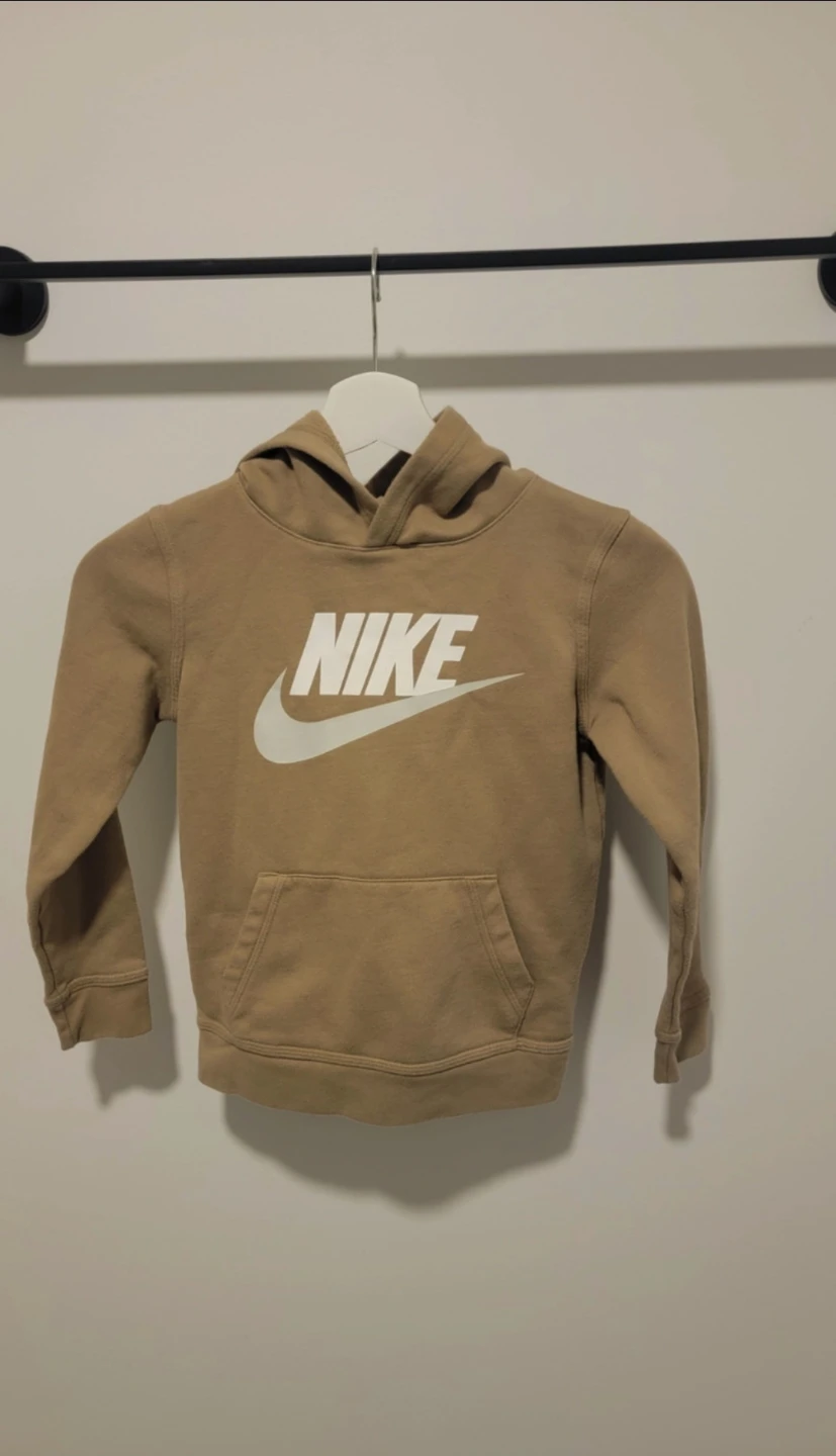 Selling a Nike kids' hoodie. It's a light brown or tan colour with the classic Nike swoosh logo in white. Great for keeping your little one warm and stylish!