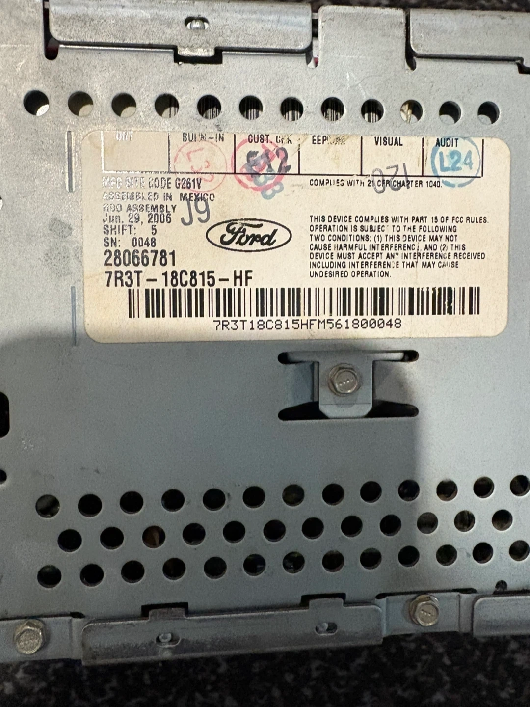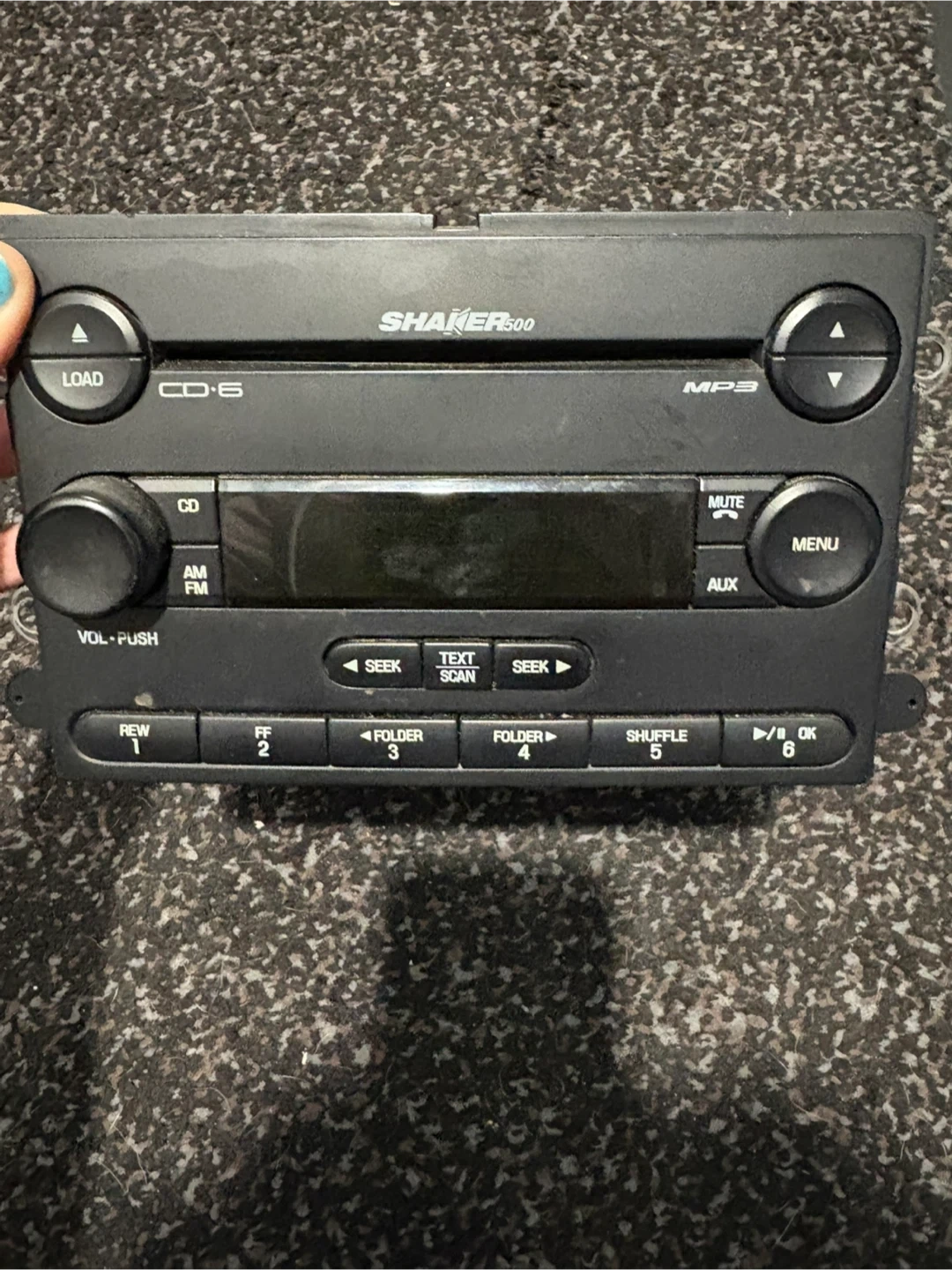 Selling a Factory Ford Shaker 500 car radio. It has a CD player that can hold up to 6 CDs. It also supports AM/FM radio and has an AUX input. Model number: 7R3T-18C815-HF