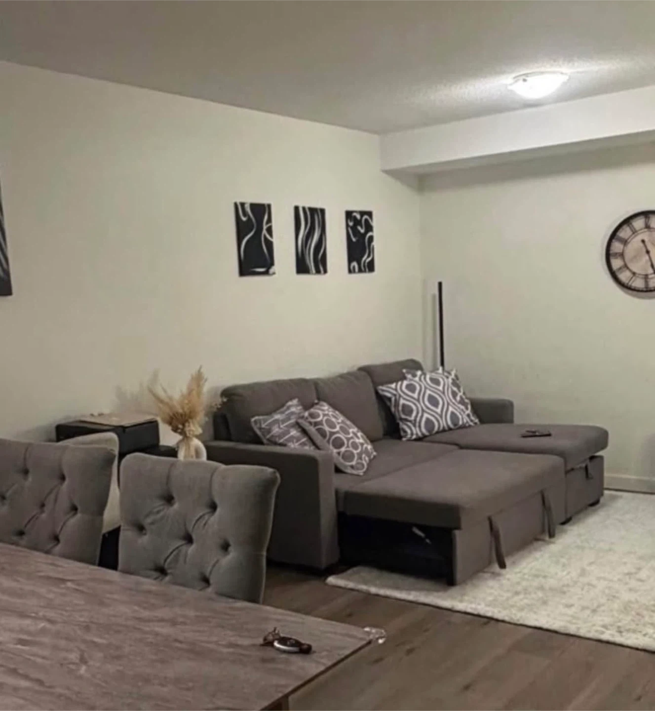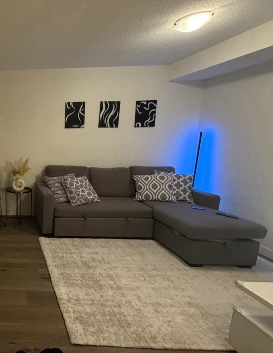 Selling a comfortable grey sectional sofa. It features a convenient pull-out bed and has storage inside couch.