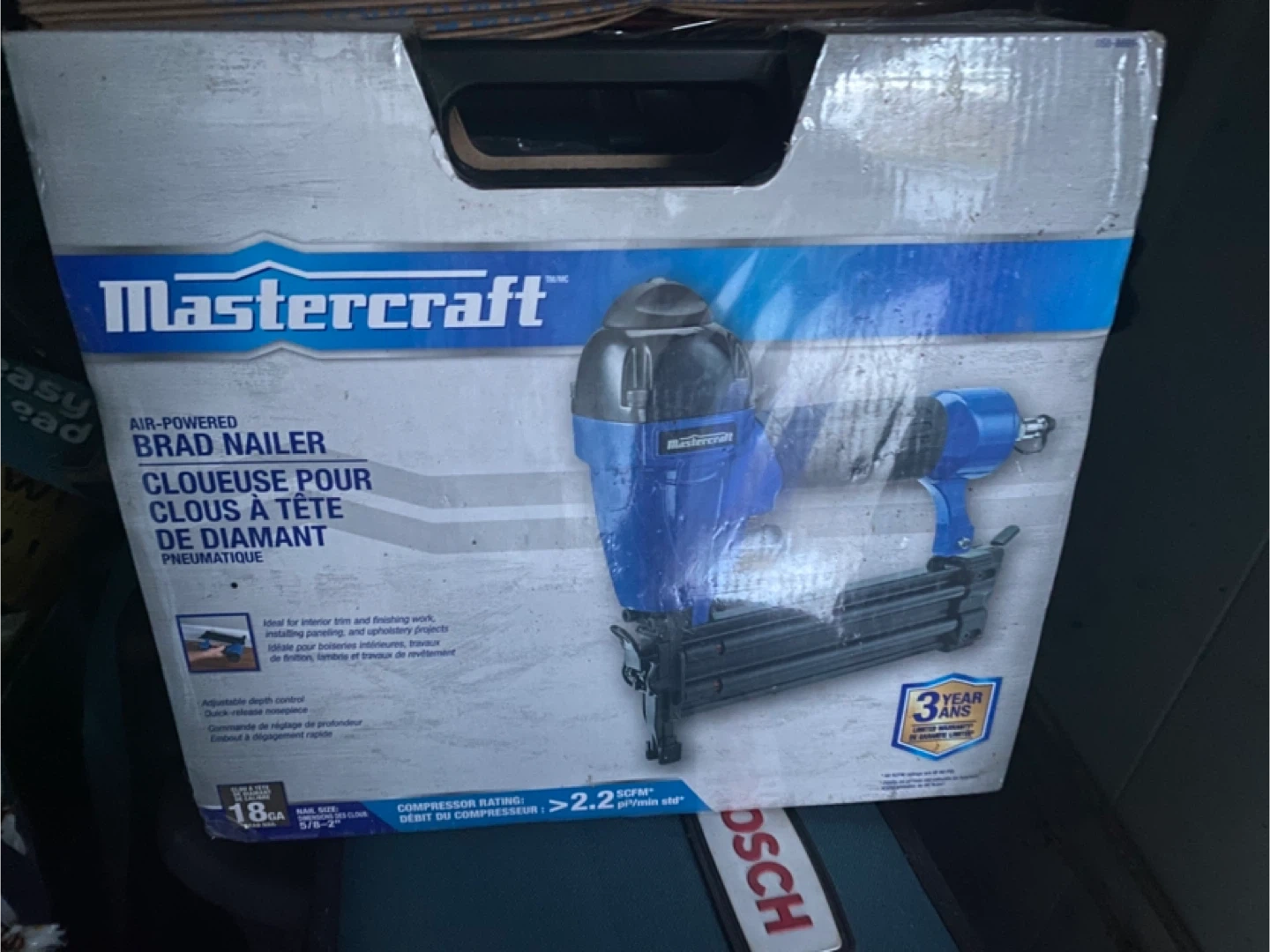 Selling a Mastercraft air-powered brad nailer. It's in excellent condition and comes in its original box! This nailer is ideal for interior trim and finishing work. It features an adjustable depth control for precise nail placement and a quick-release nosepiece for easy jam clearing. It also has a safety anti-firing mechanism for added safety