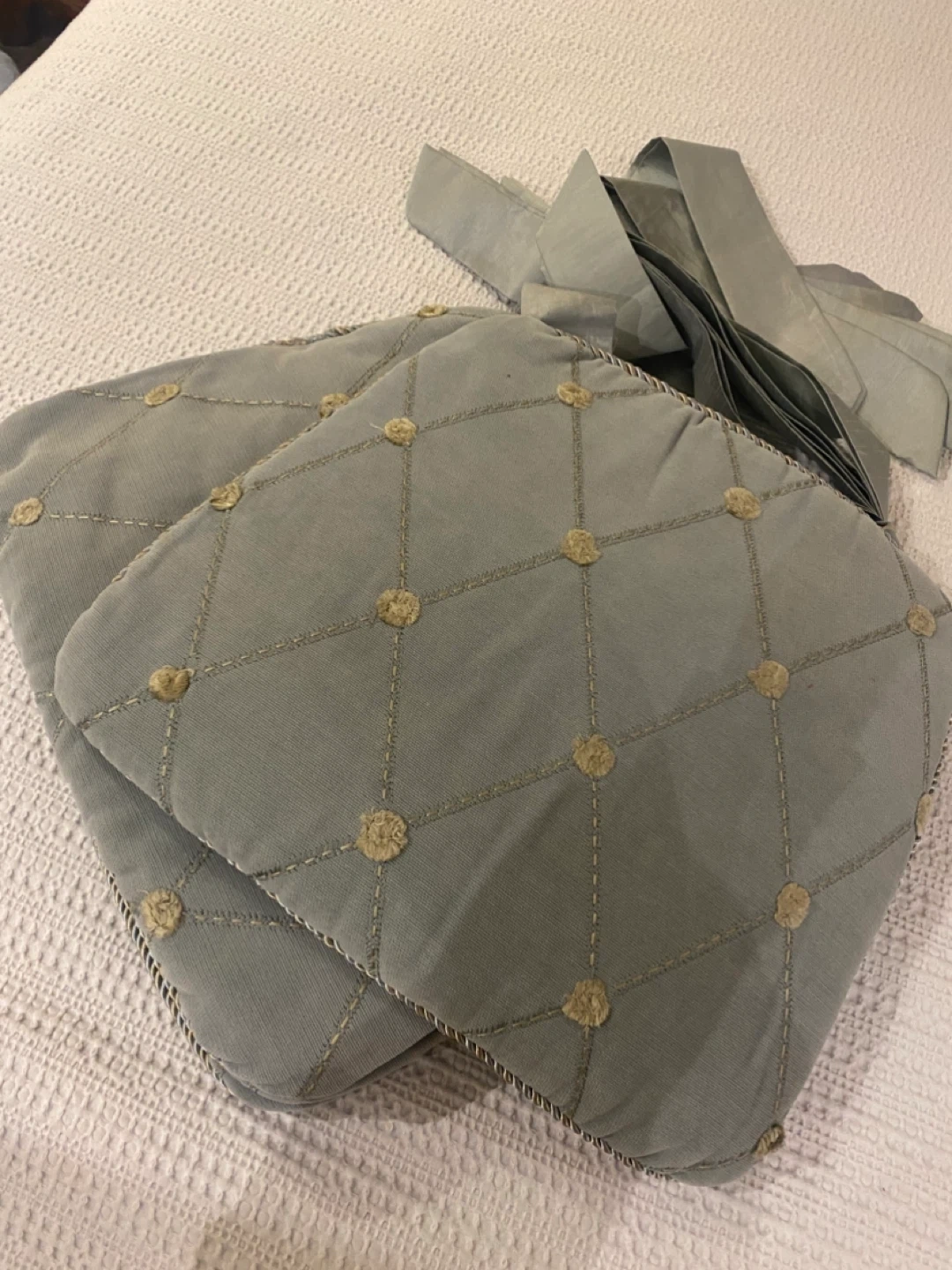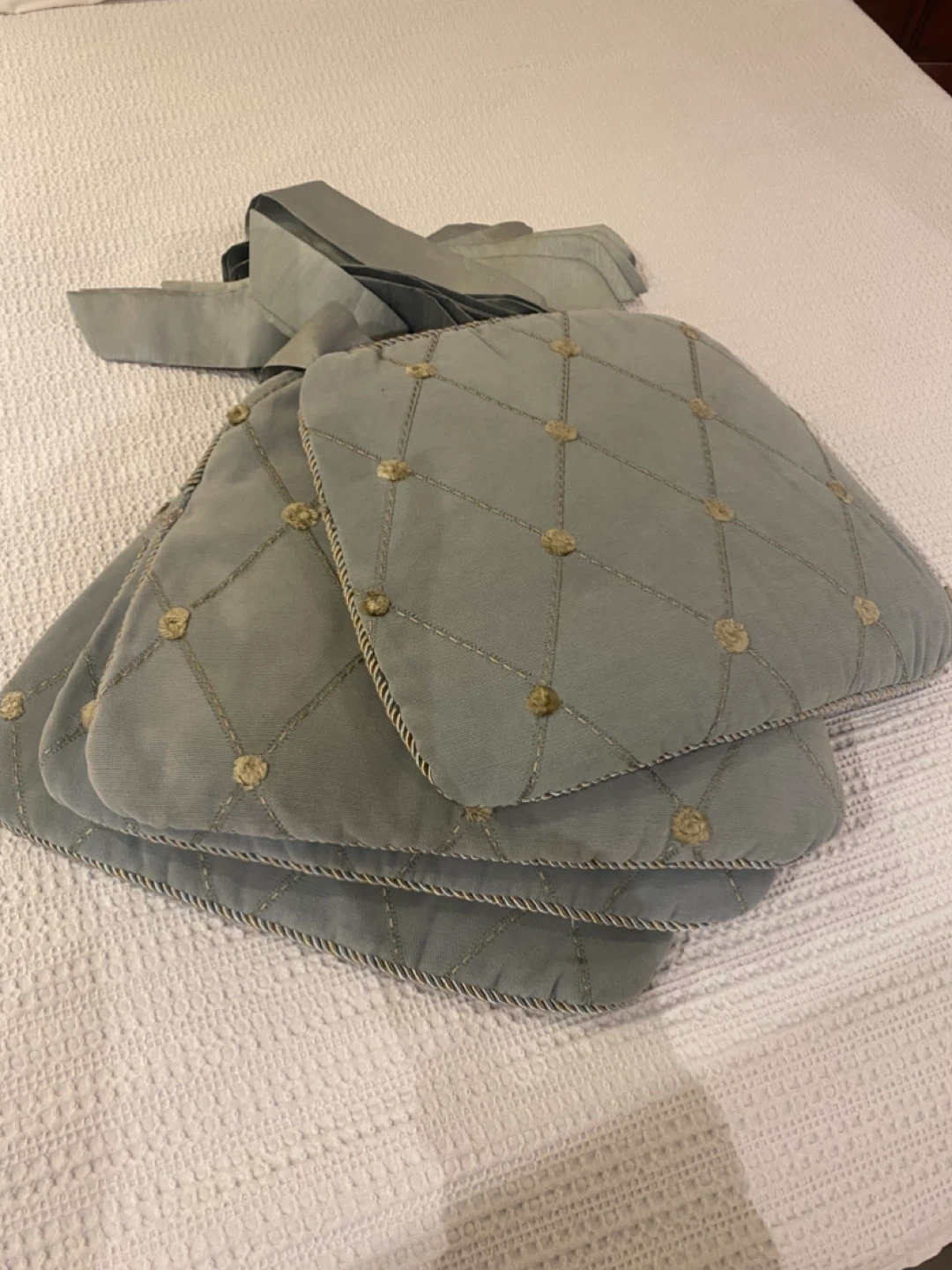 Here's a chair cushion sets of 4 with ties! It's a light blue colour with a quilted pattern. Perfect for adding a touch of comfort and style to your dining chairs or any other seating area