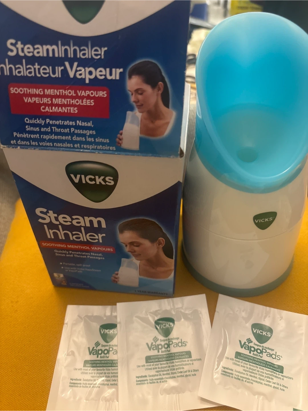 It helps with coughs, colds, seasonal allergies, and sinusitis. Soothing steam targets the nose, mouth, and throat to help naturally alleviate congestion and irritation. Includes Vicks VapoPads for a comforting menthol scent. Originally bought for $75.99 plus tax. Model/Modèle V1300CANV1