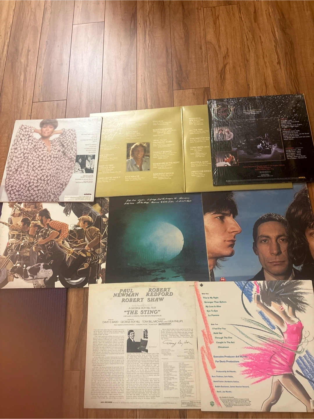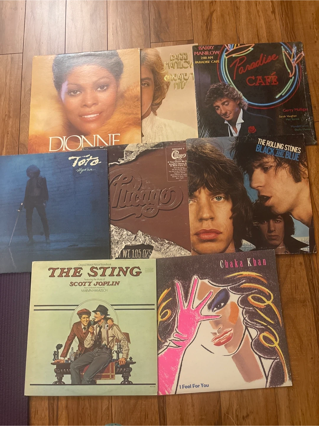 Includes albums from Dionne Warwick, Toto (Hydra), Barry Manilow (Paradise Cafe), Chicago, The Rolling Stones (Black and Blue), Chaka Khan (I Feel For You), and The Sting soundtrack featuring Scott Joplin and Marvin Hamlisch