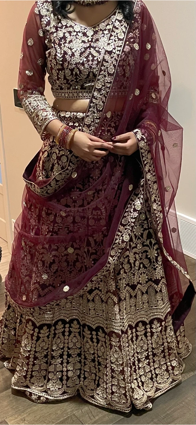 Beautiful maroon lehenga choli with detailed silver and gold embroidery. Perfect for a special occasion! The fabric is a rich maroon colour with a sheer net dupatta. You can alter to bigger size