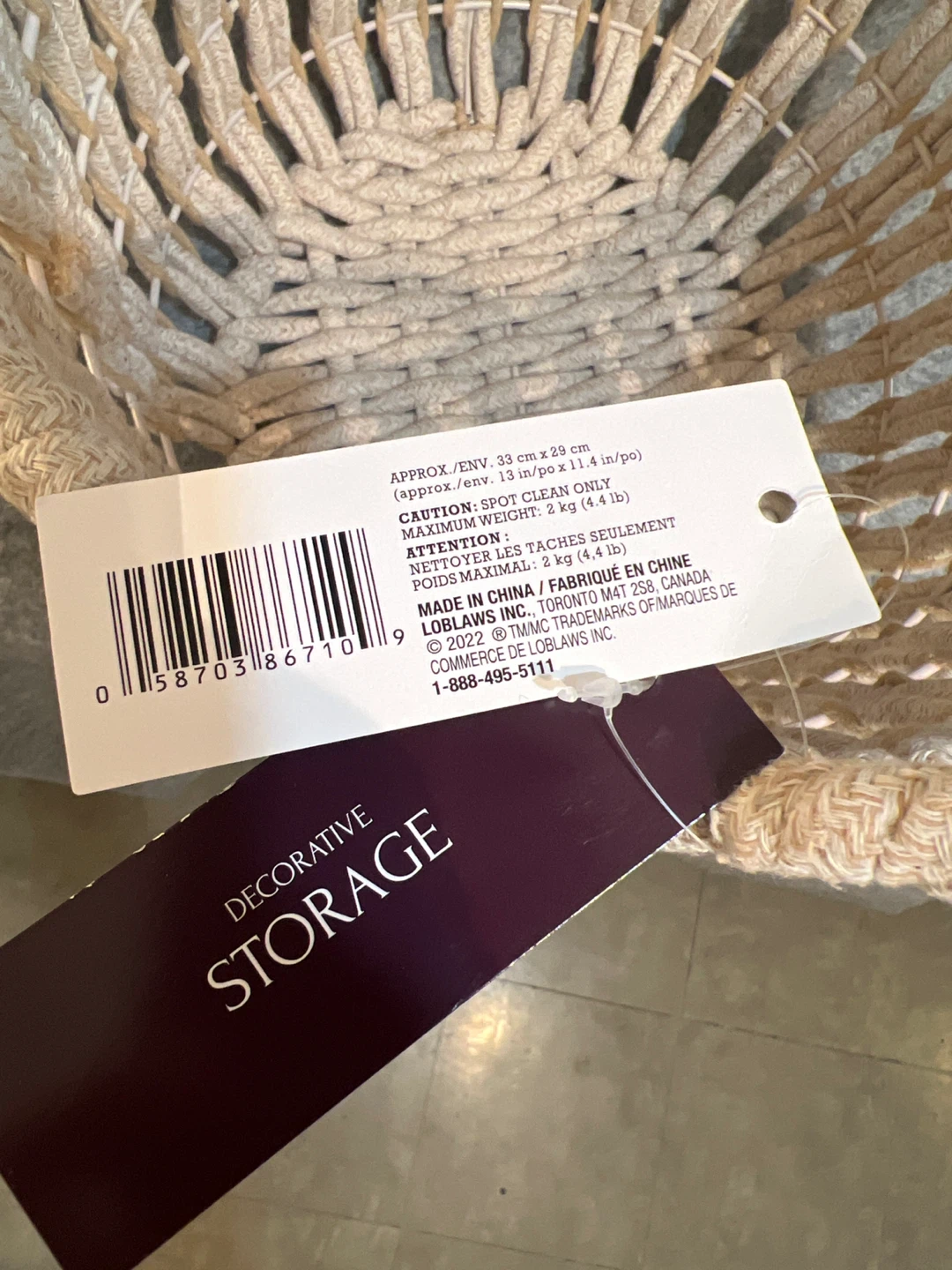 I'm selling a lovely decorative storage basket from Life at Home. It's in great condition and ready to add a touch of charm to your space! The basket is approximately 33 cm x 29 cm (approx. 13 in/po x 11.4 in/po) and has a maximum weight capacity of 2 kg (4.4 lb)