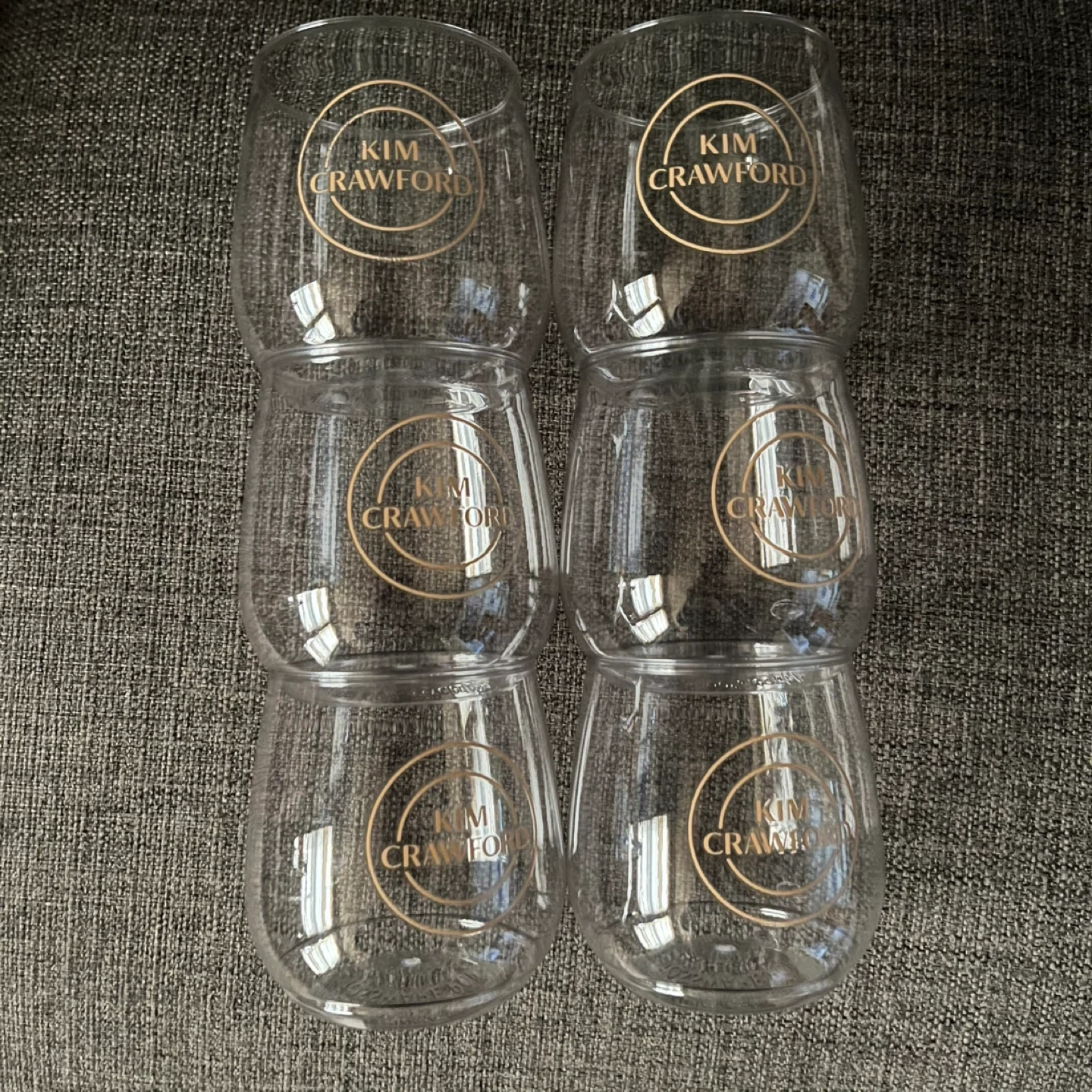 Set of 6 Kim Crawford stemless wine cups. They are made of thin plastic and great for casual get-togethers or everyday use. They feature the Kim Crawford logo in gold. Add a touch of elegance to your wine experience!
