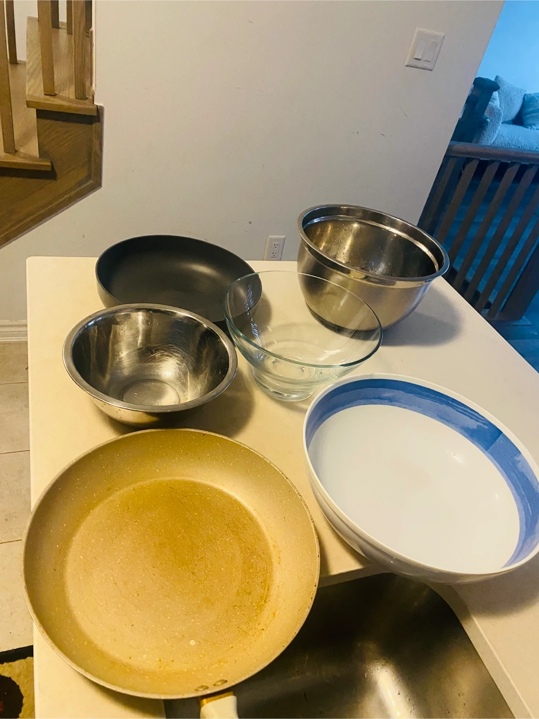 Selling a set of mixed kitchen bowls and a frying pan. The set includes stainless steel bowls, a glass bowl, and a ceramic bowl with a blue rim. The frying pan has a non-stick surface and a cream-coloured handle. Great for cooking and baking! $2 each, glass bowl $3, Pan $10