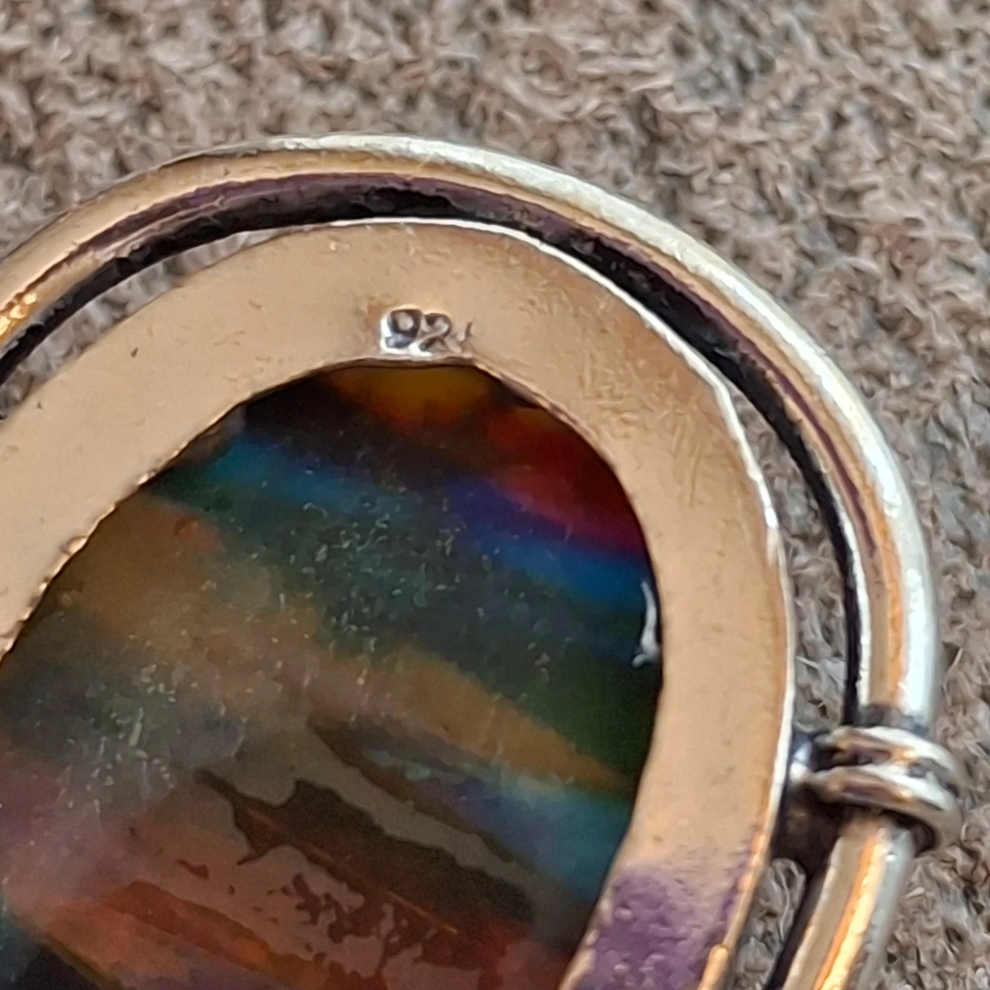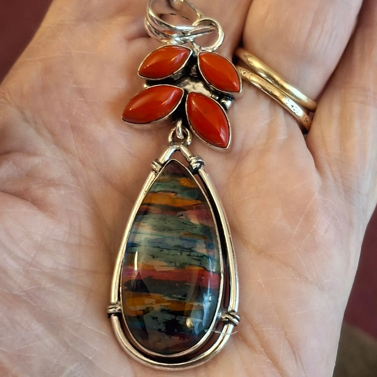 Selling a lovely sterling silver pendant! It features a teardrop-shaped ammolite opal with colourful stripes and is accented with red coral details at the top. It does not come with a chain. Stamped '925' to indicate sterling silver.
