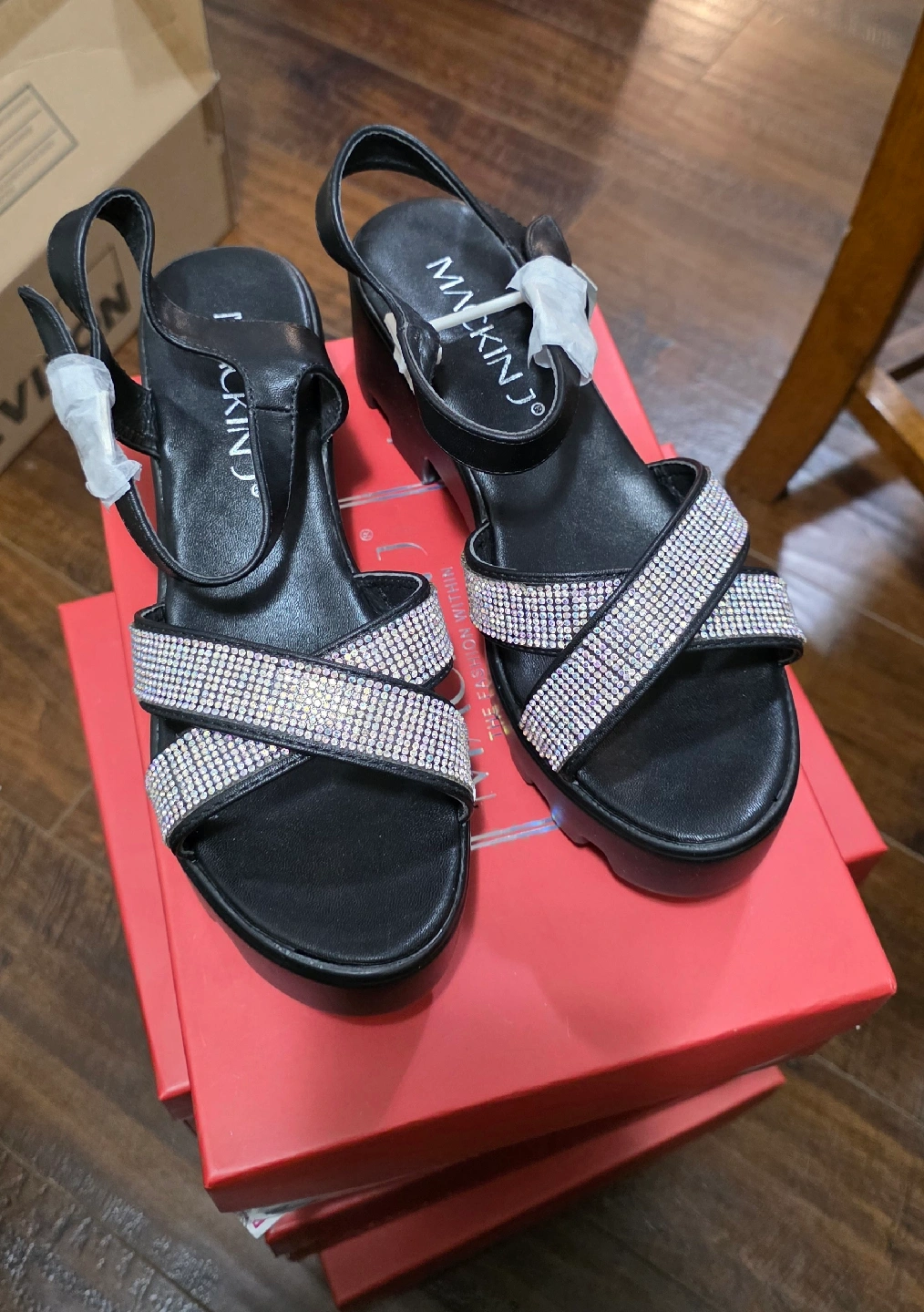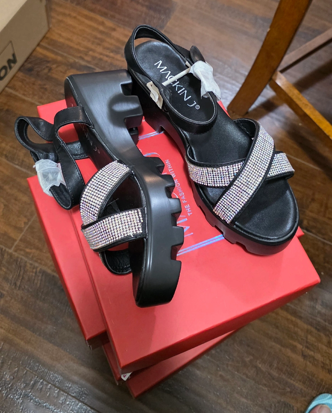 Brand new These Mackin J platform sandals are super stylish and ready for a new home! They're a size US 8.5 and come in classic black. The design features a cute, sparkly cross-strap detail. They come with the original box too!