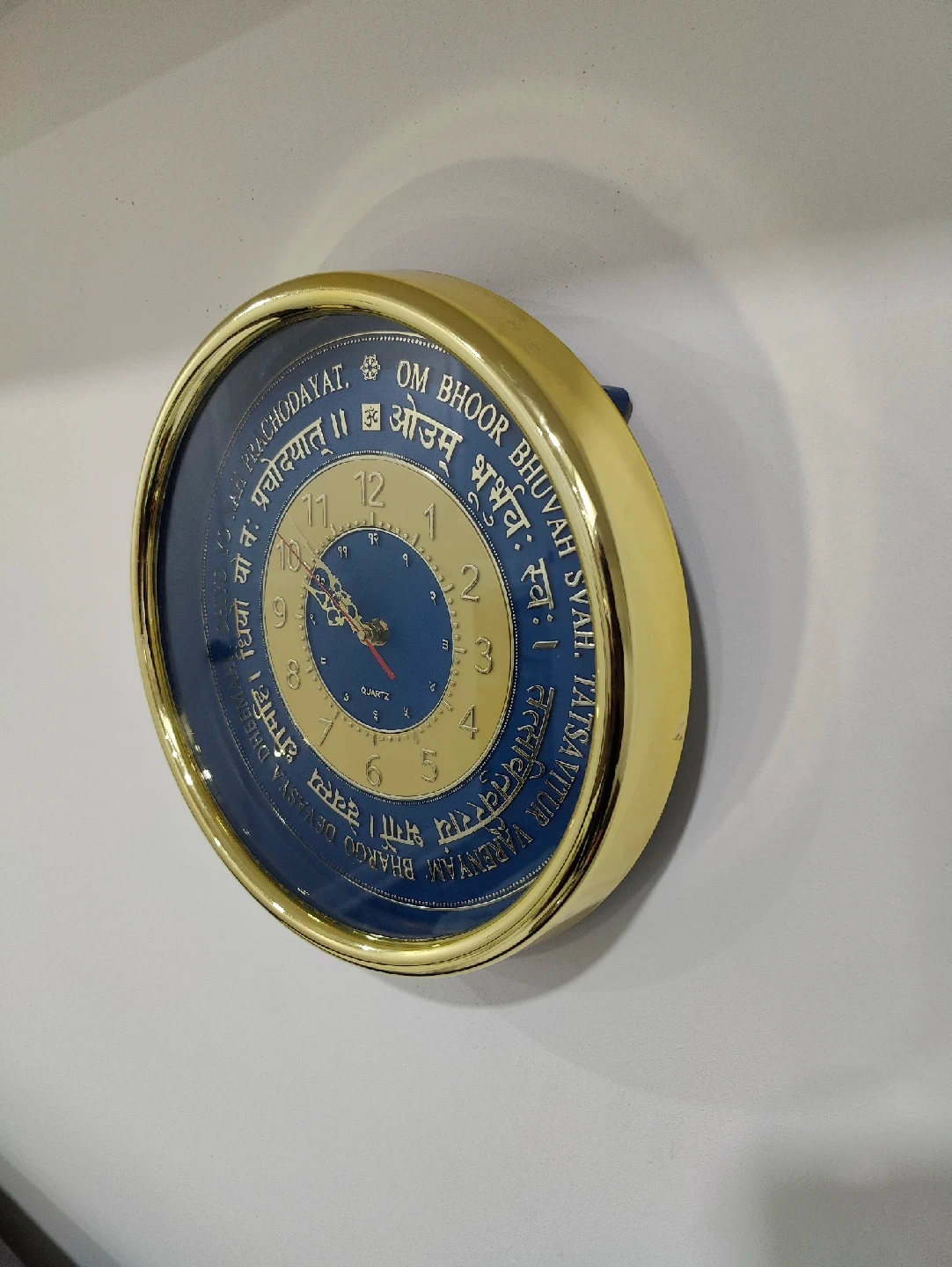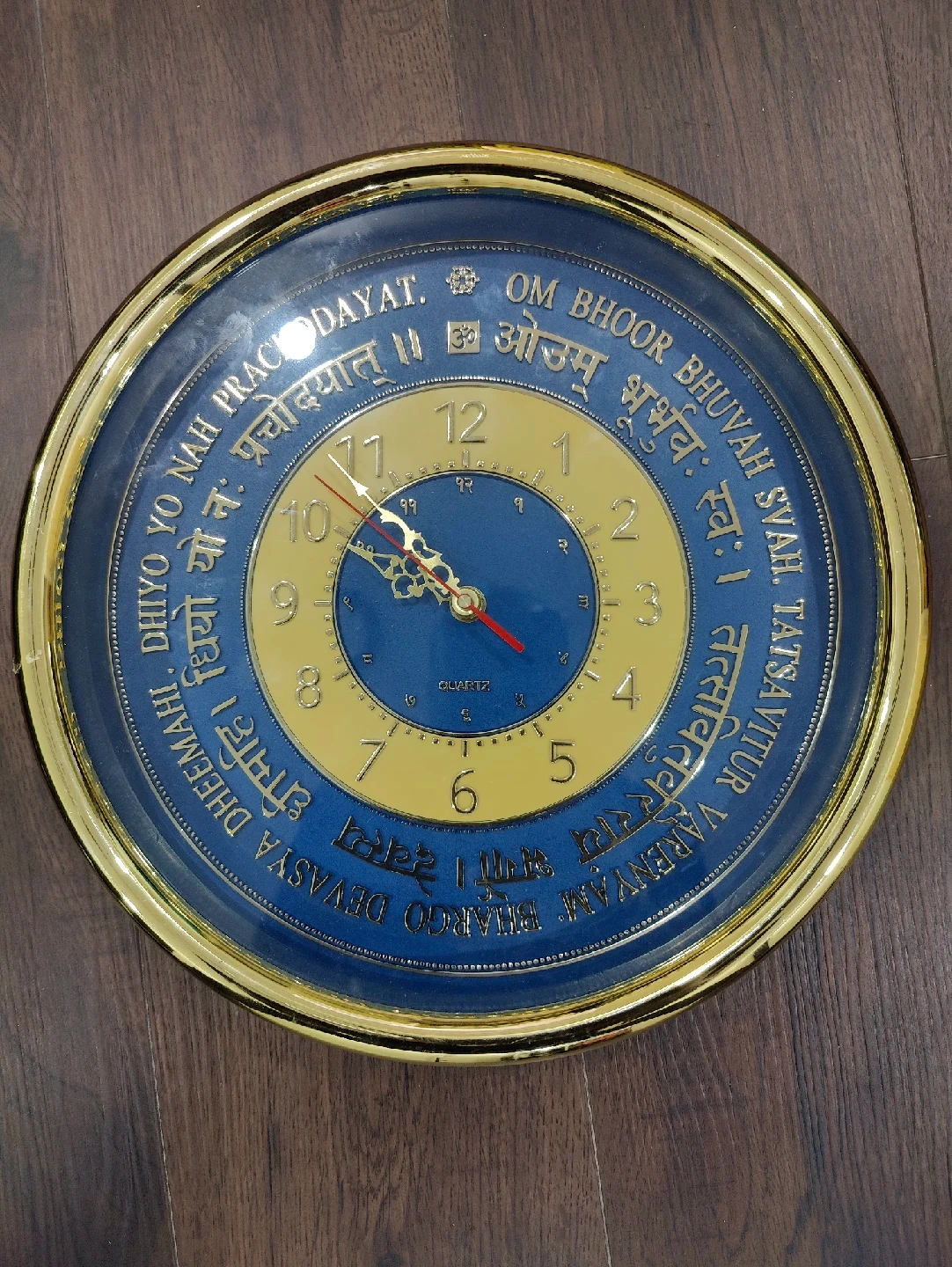 103Here's a wall clock with a unique design featuring the Om Bhoor Bhuvah mantra. It has a gold-tone frame and a blue and gold face. The clock appears to be in good condition and would make a lovely addition to any room