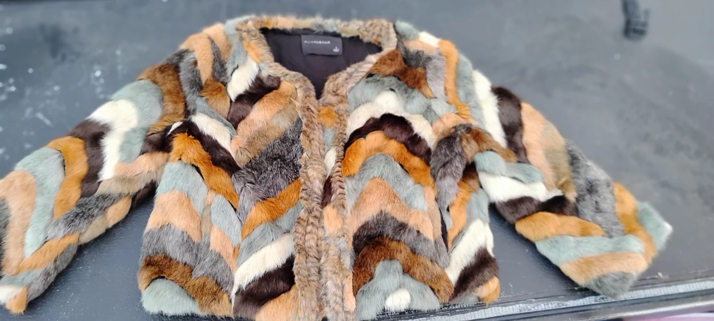 This is a beautiful fur jacket from ALYSI Milano. It features a unique multi-color chevron pattern that is sure to turn heads. Perfect for adding a touch of luxury to any outfit!