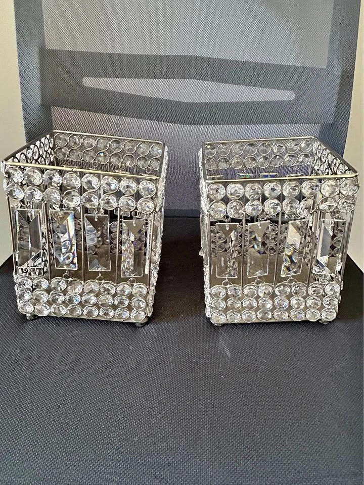 10Excellent condition, chrome and glass candle holders. Each $25. 7 inches high by 5.5 inches wide.