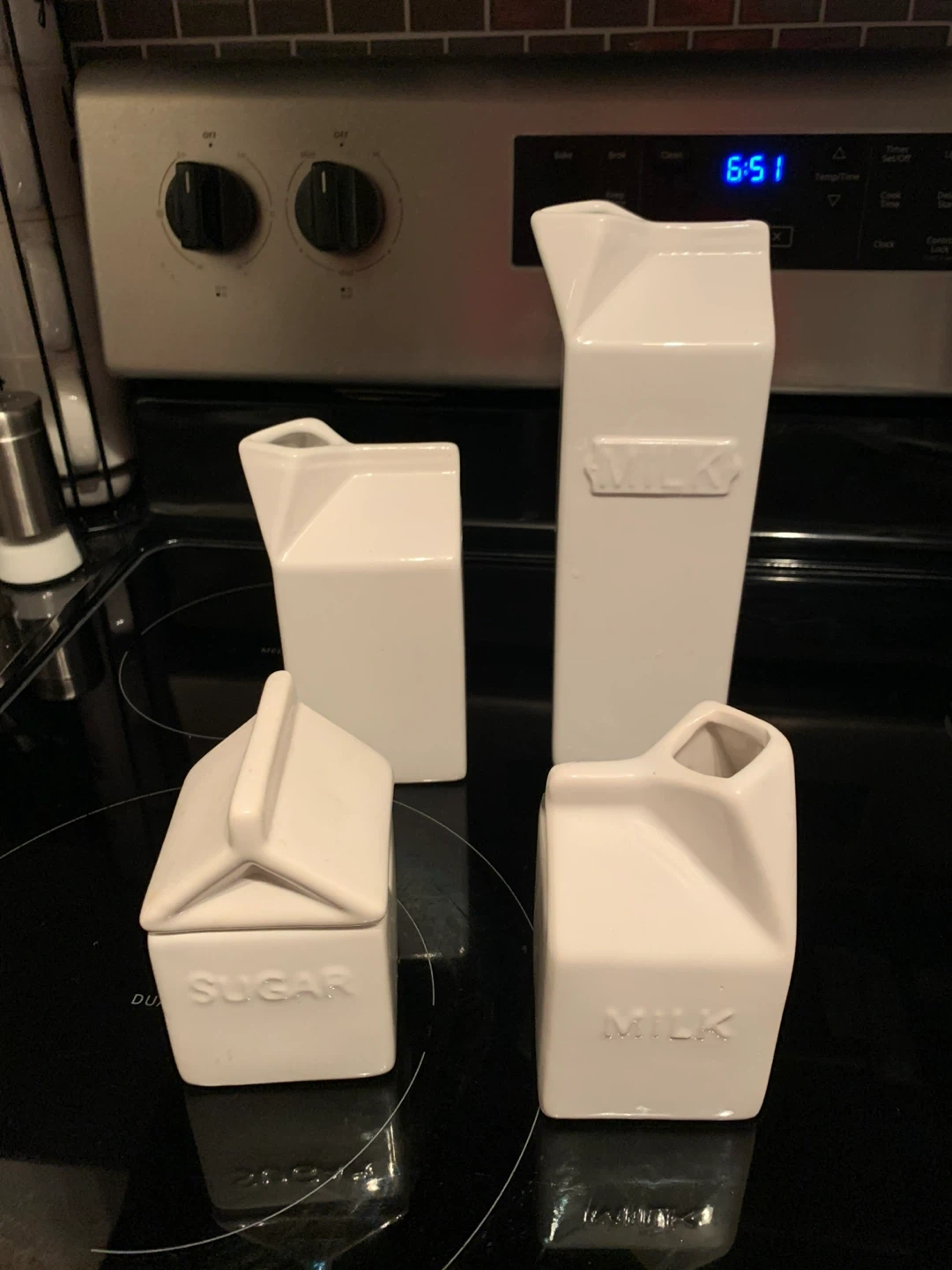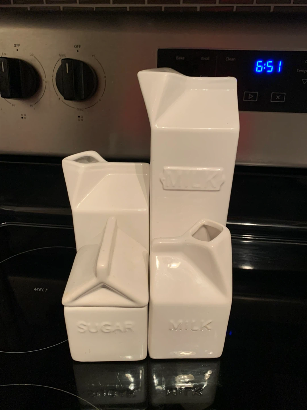 211Here's a cute ceramic container set shaped like milk cartons! One is labelled 'Milk' and the other is labelled 'Sugar'. They're in NEW condition and would look adorable in any kitchen Didn’t end up using
