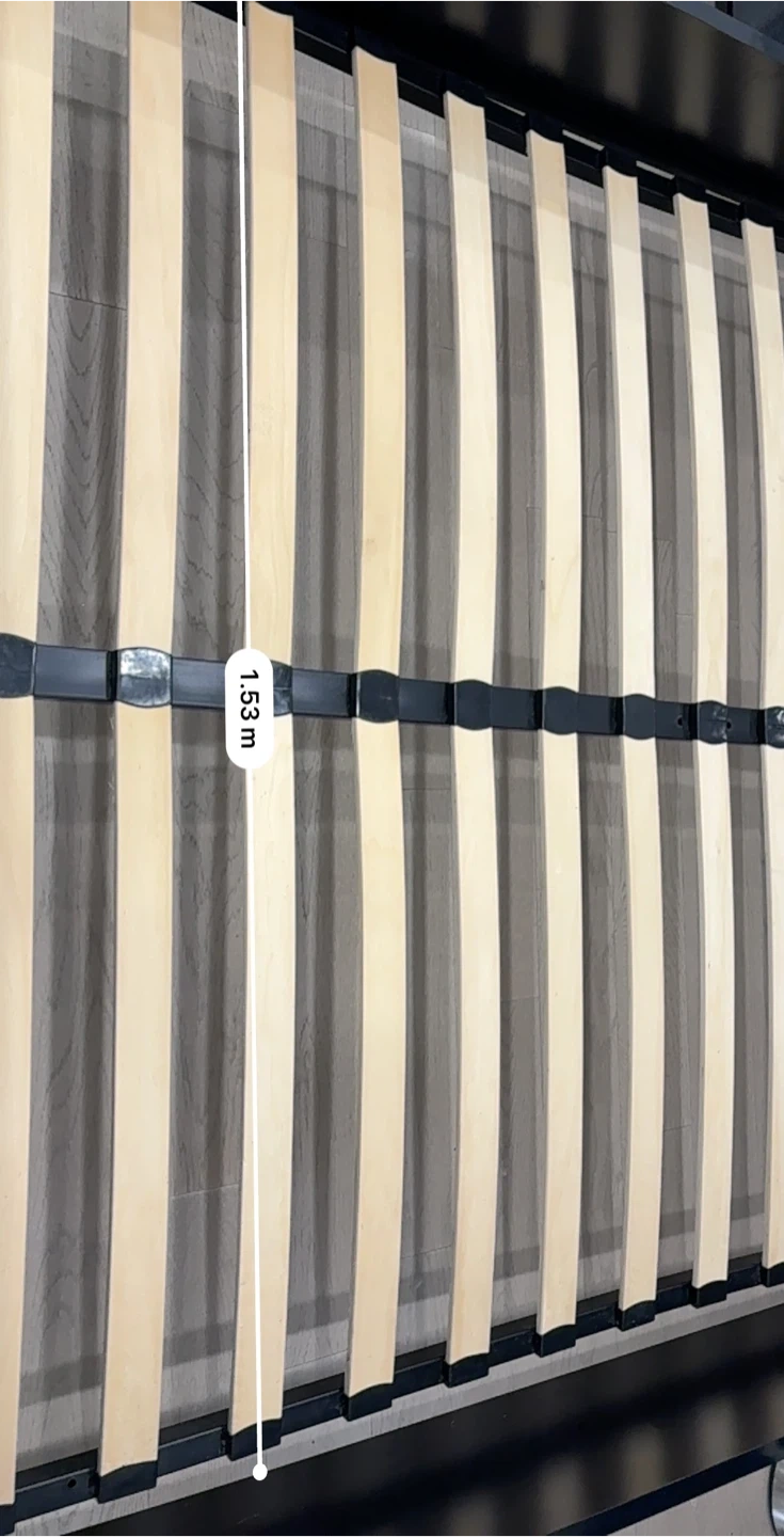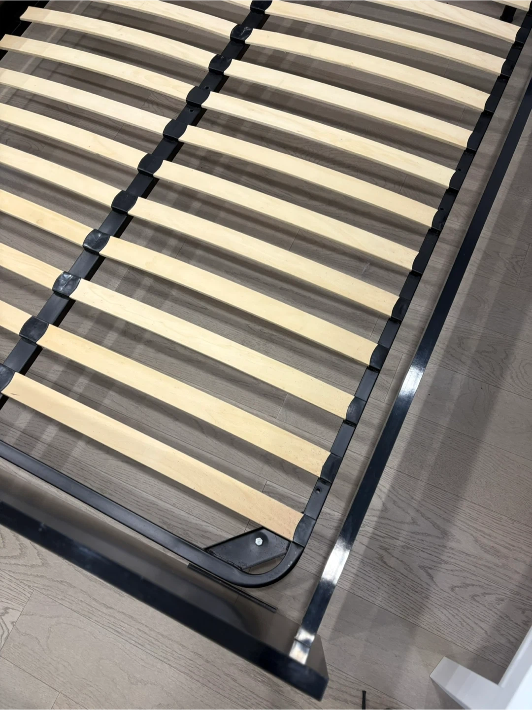 Selling a queen bed frame in black. The dimensions are approximately 1.96m in length and 1.24m in height. It's in good condition and ready for a new home!