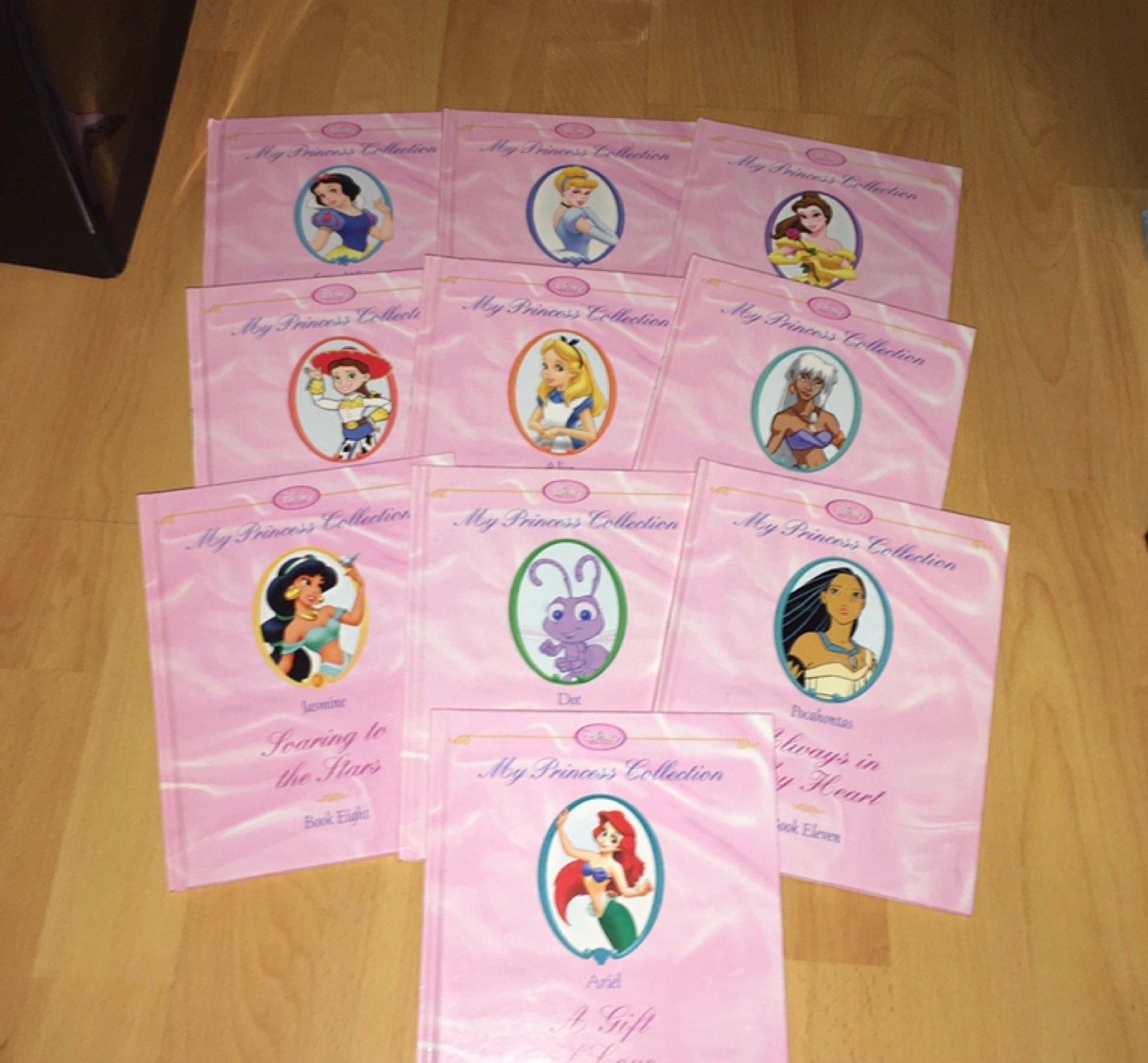 Books featuring different Disney princesses like Snow White, Cinderella, Belle, and more.
