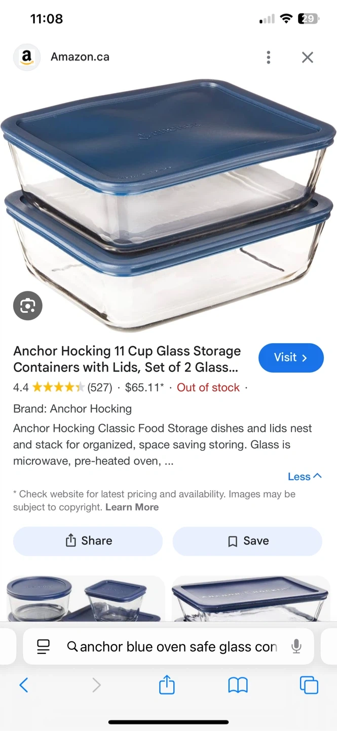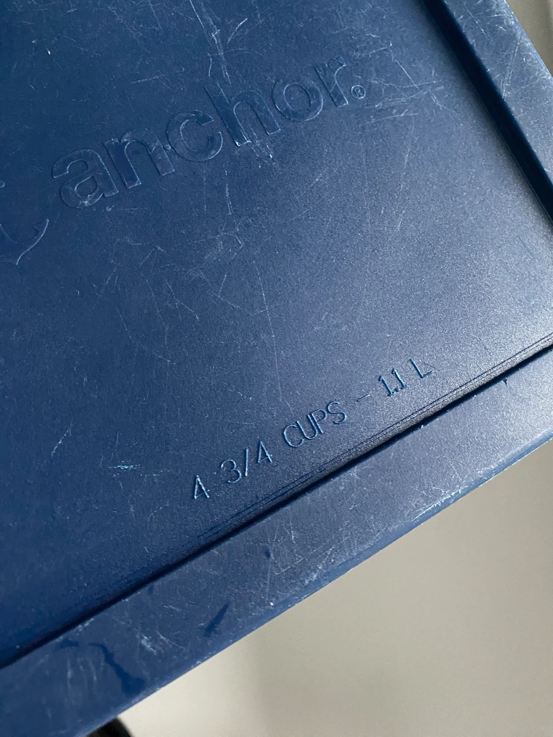 Selling an Anchor Hocking glass storage container with a blue lid. It holds 4 3/4 cups or 1.1 L capacity. It's microwave, refrigerator, dishwasher and freezer safe, and can be used in a conventional oven!