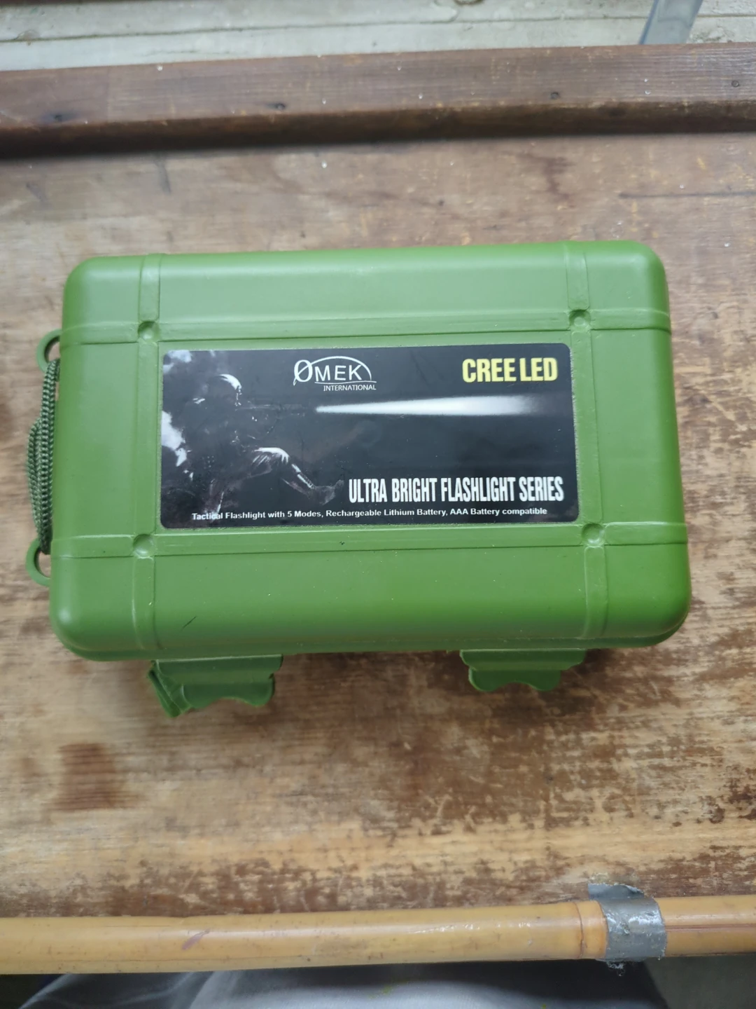 Selling an OMEK CREE LED Ultra Bright Flashlight Series. It comes with its original box and all included components, including a rechargeable lithium battery and an AAA battery adapter. This tactical flashlight has 5 modes, making it a versatile tool for various situations.