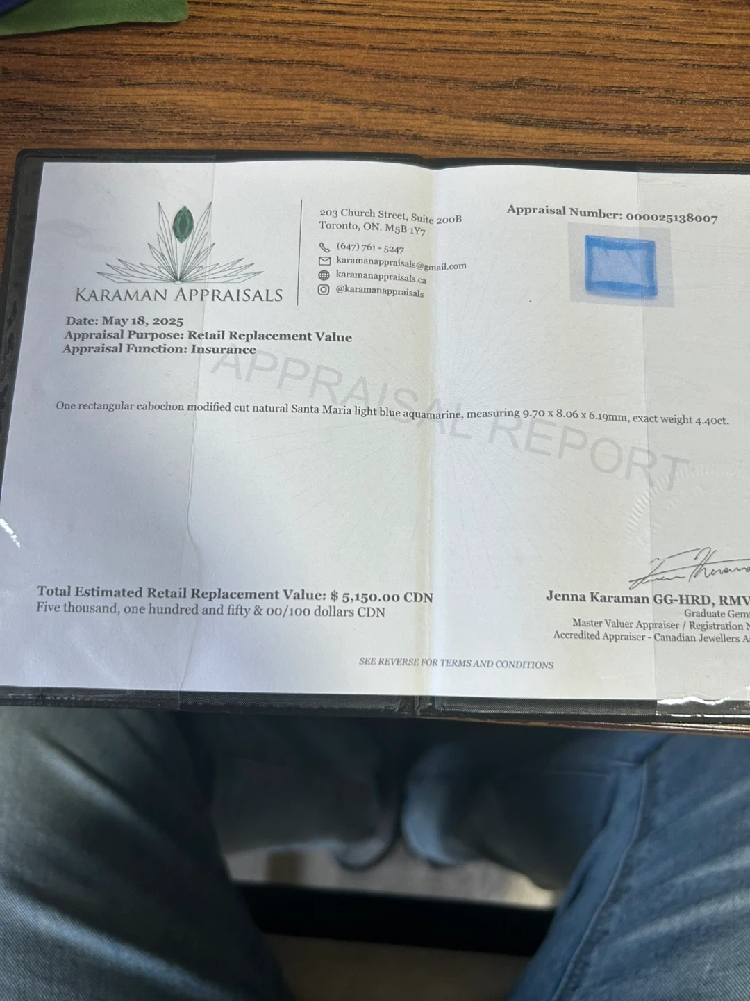 Selling a beautiful Santa Maria light blue aquamarine gemstone. This rectangular cabochon cut gemstone measures 9.70 x 8.06 x 6.19mm and weighs approximately 4.40ct. The total estimated retail replacement value is $5,150.00 CDN.