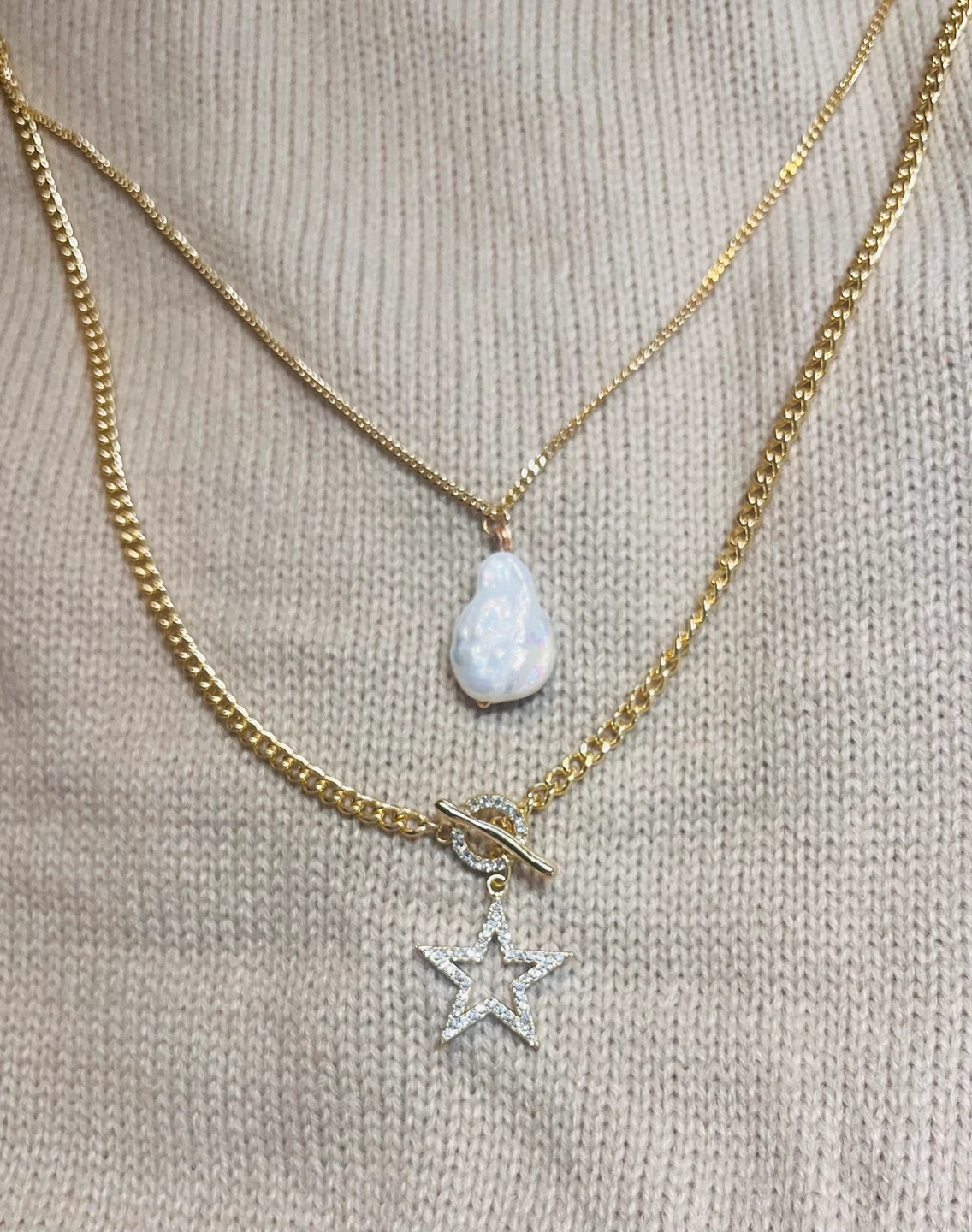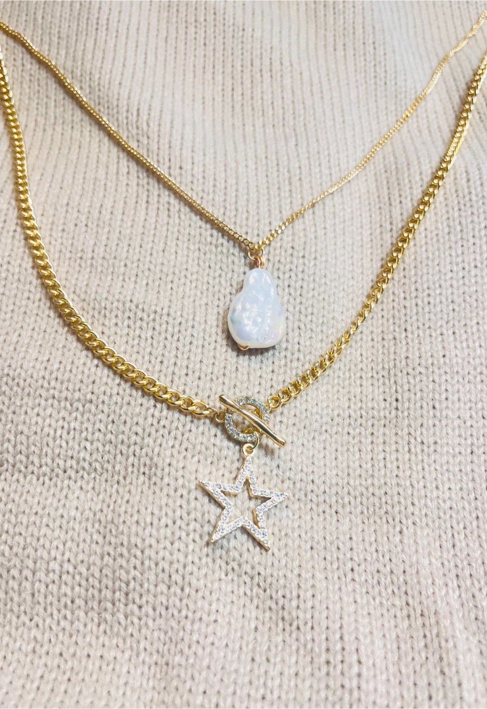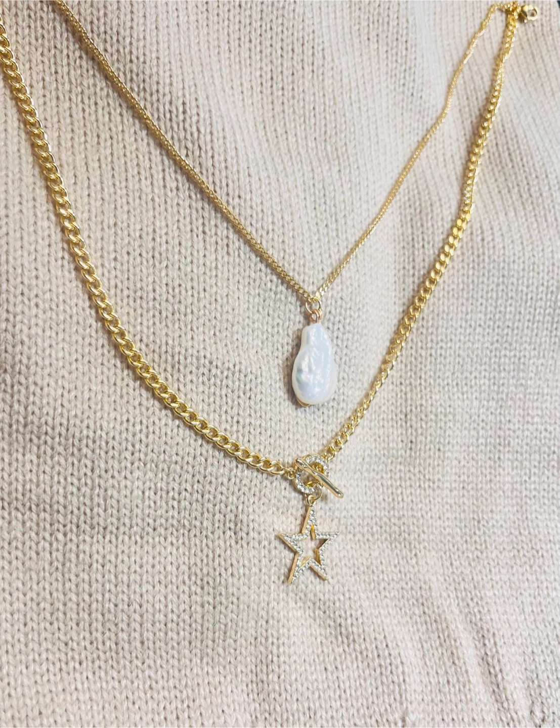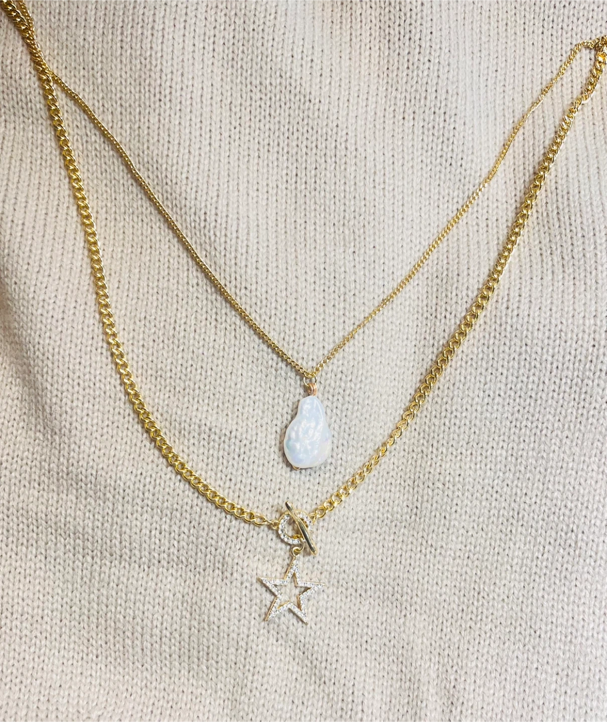 Selling a beautiful gold-toned layered necklace! It features a shorter chain with a baroque pearl pendant and a longer, bolder chain with a sparkling star charm. Perfect for adding a touch of elegance to any outfit